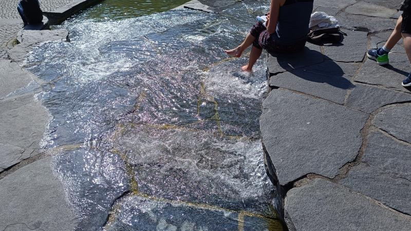 die von dort auf die sich am Brunnen ausruhenden Menschen herabschauen.