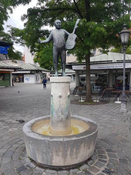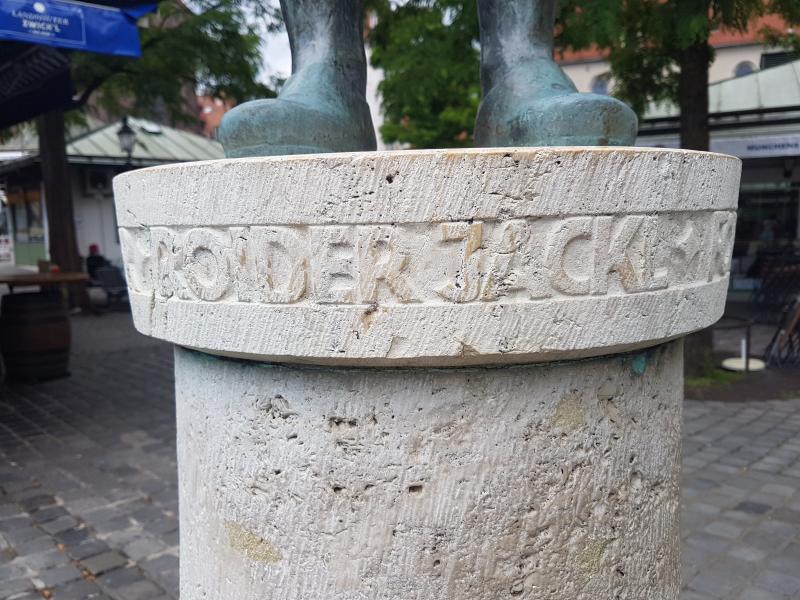 Brunnen ist dem Gstanzlsänger Roider Jackl gewidmet. Der am 17. Juni 1906 in Weihmichl bei Landshut geborene Roider Jackl war von Beruf eigentlich Förster. Er schaffte es, das Gstanzlsingen von Wirtshausbühnen in das Licht der Scheinwerfer zu heben, indem er mit überdurchschnittlicher Könnerschaft diese Form des kurzen Spottliedes darbot. Er nahm sowohl aktuelle politische Geschehnisse aufs Korn wie auch allgemein menschliche Schwächen. Er war Mittelpunkt in der "Weiß - blauen Drehorgel" oder auch beim Salvatoranstich (zwischen 1954 und 1974) auf dem Nockherberg. Zwei Jahre nach seinem Tod am 9. Mai 1975 in Freising, kam er auf dem Viktualienmarkt im Stadtbezirk 01 - Altstadt - Lehel in dem von Hans Osel gestalteten Brunnendenkmal zu Ehren. Der Bronzeguss wurde von der Kunstgießerei Werner Braun ausgeführt, der Brunnenaufbau aus Marchinger Muschelkalk durch den Münchner Steinmetz Hans Rehm gestaltet. Die eingravierte Inschrift gibt bekannt: "Roider Jackl, Förster, Gstanzlsänger, Levitenleser". Die Brunnensäule hat sechs Ausläufe, die wie kleine Kanonen auch nach Roider Jackls Tod auf Politiker, Großkopferte, Siebengescheite, Protzerte, Großmäulige, Gwapplte und Bazis zielen. Der Brunnen wurde von Hans Osel gestaltet. Er hat einen durchschnittlichen Jahres - Wasserverbrauch von 5722 Kubikmetern. Der "Roider Jackl" war der "weiß - blaue Troubadour und G´stanzlkönig". Schon zu seinen Lebzeiten sang er von "A Denkmal, wo‘s Wasser rausrinnt": "Und bal der Hahn kraht, nacha kraht er am Mist - Nacha ändert sich‘s Wetta oder‘s bleibt wia‘s is. Jetzt muaß i aufhör‘n zum Singa - sonst werd ‘ i berühmt - Sonst kriag i a so a Denkmal - wo‘s Wasser rausrinnt." Jetzt hat er‘s, dargestellt in der Pose, in der er beim Starkbier - Ausschank jahrzehntelang die "Großkopferten" derbleckte. Er habe, so OB Georg Kronawitter, "mit seiner Jägerfaust nach manchem Großkopferten gegriffen..." Als Denkmal - Sponsoren für den größten Bayerischen G‘stanzl - Macher durften die möglicherweise gar nicht von ihm "Derbleckten" dann doch den Brunnen aufdrehen: Generaldirektor Paul Werner von der Bayern - Versicherung und Konrad Peteranderl, Bezirksdirektor von der Landesbausparkasse. Stadtpfarrer Müller (Heiliggeist) und Zistl (St. Peter) seien sich zwegens der Brunnen - Zugehörigkeit beinahe in die Haare geraten, weil die Gemeindegrenze "net grad pfeilgrad" durch den Viktualienmarkt verläuft. Dieser Brunnen ist ebenfalls ein ausgewiesener Trinkbrunnen. Es handelt sich hier um einen städtischen Brunnen. |