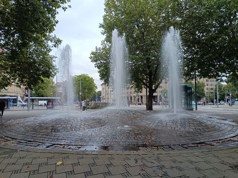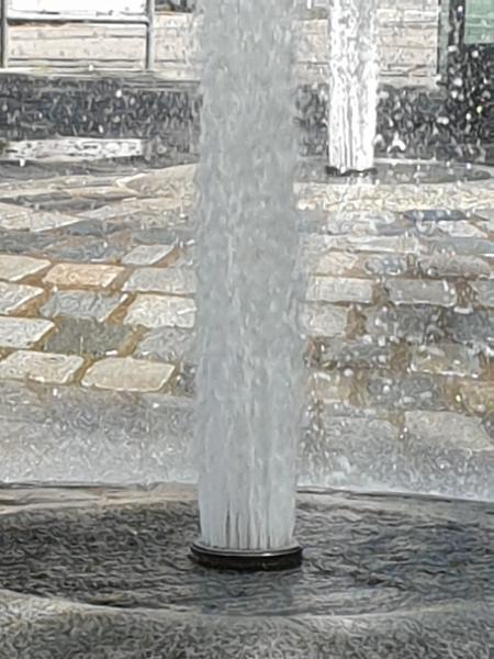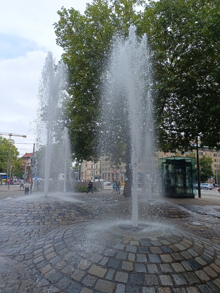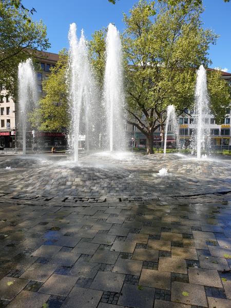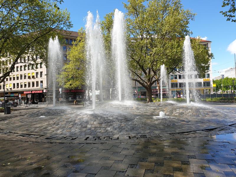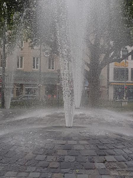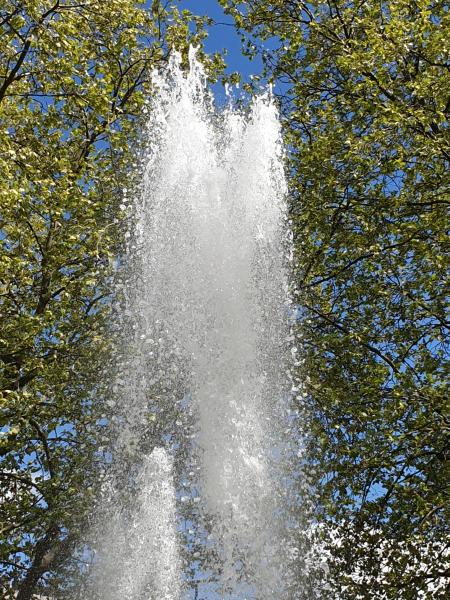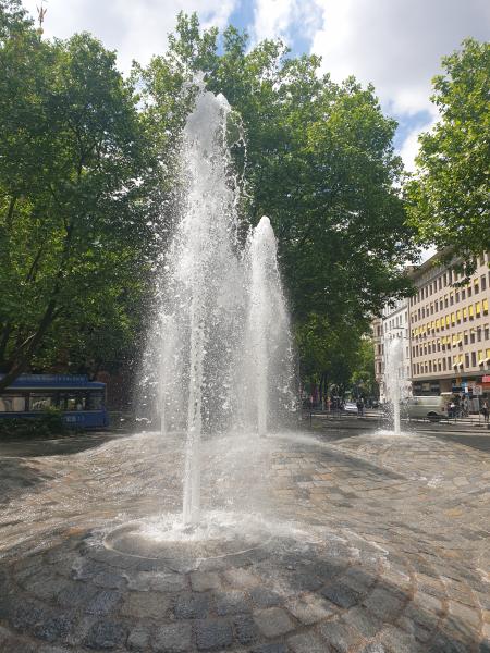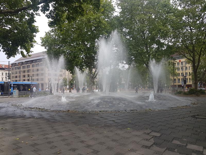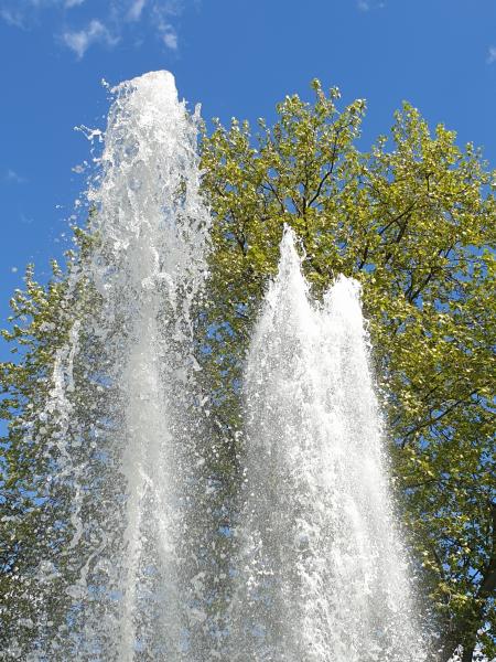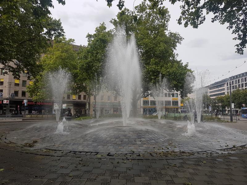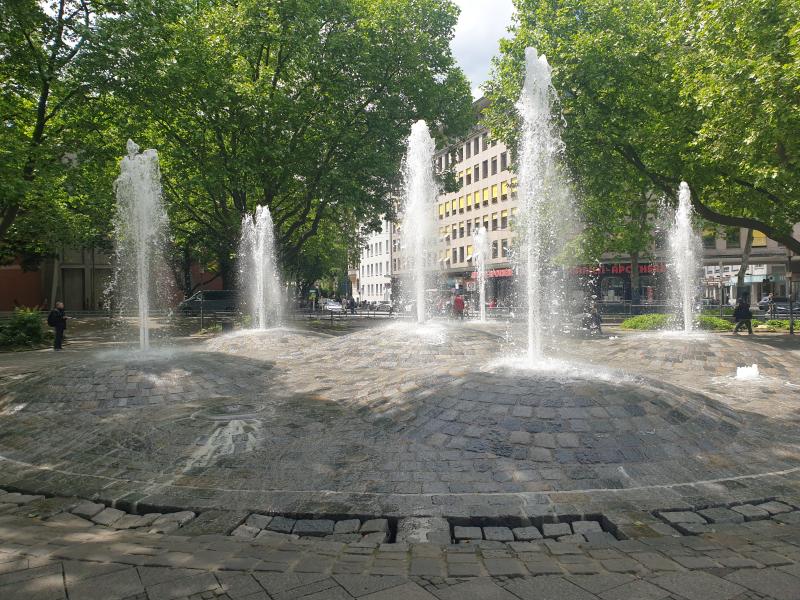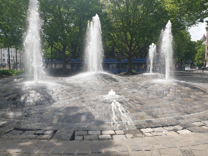 sechs Fontänen angeordnet, deren Wasser bis zu 3,50 Meter hoch sprudelt.