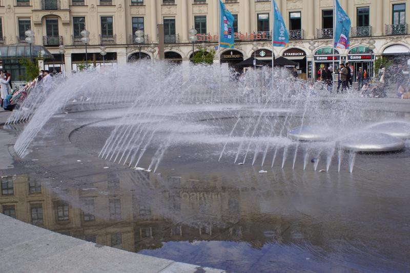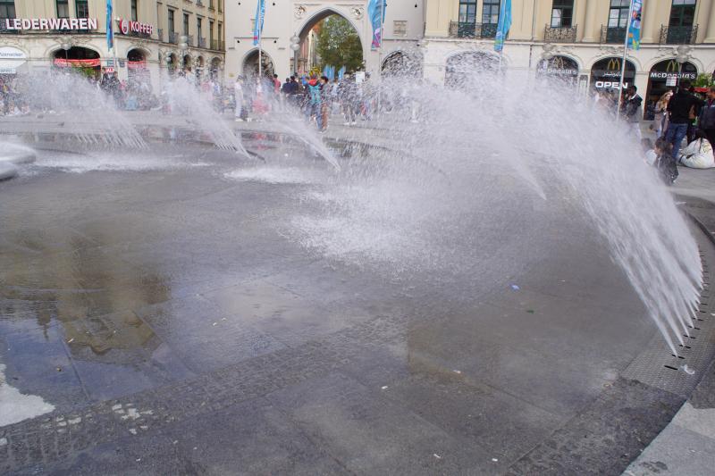 von unten. Außerdem sind um die Stachus - Fontäne, die sich