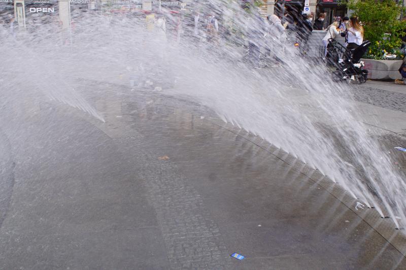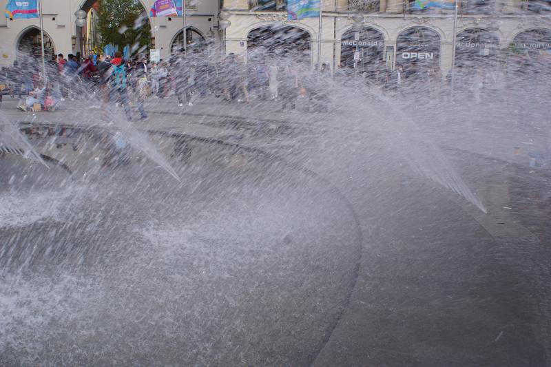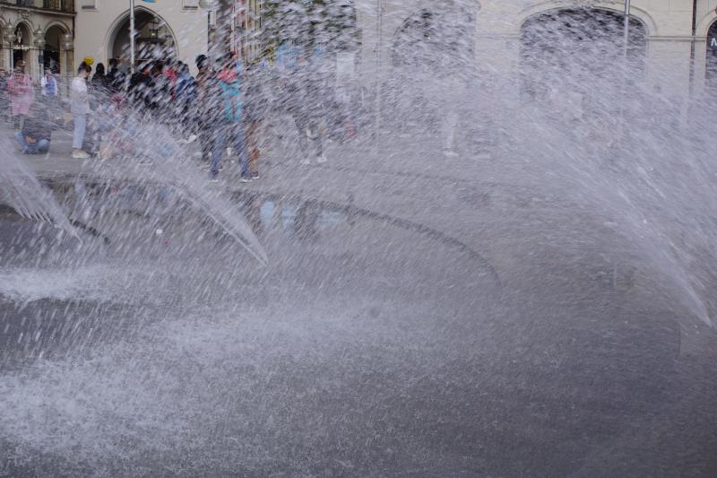 Erfrischung suchende Passanten. Dazu, ebenso rundherum, immer wieder auch