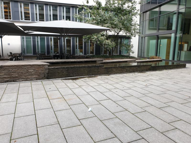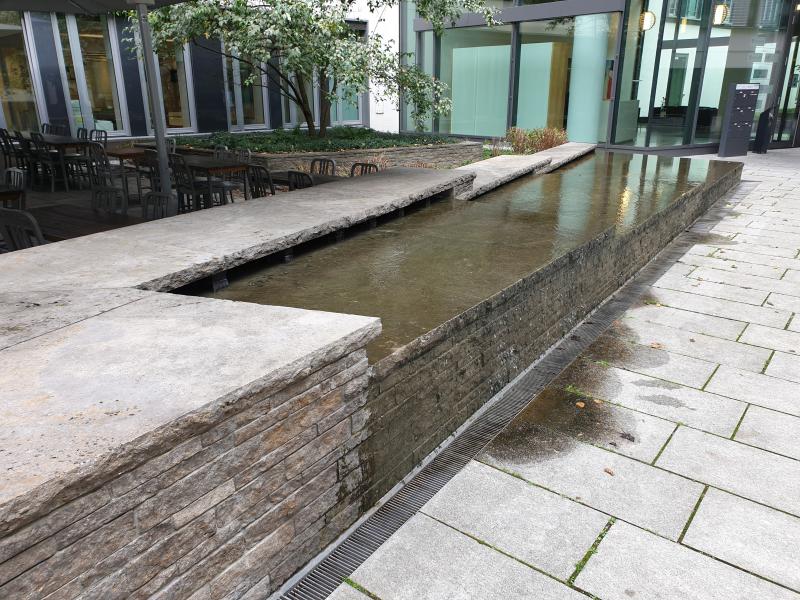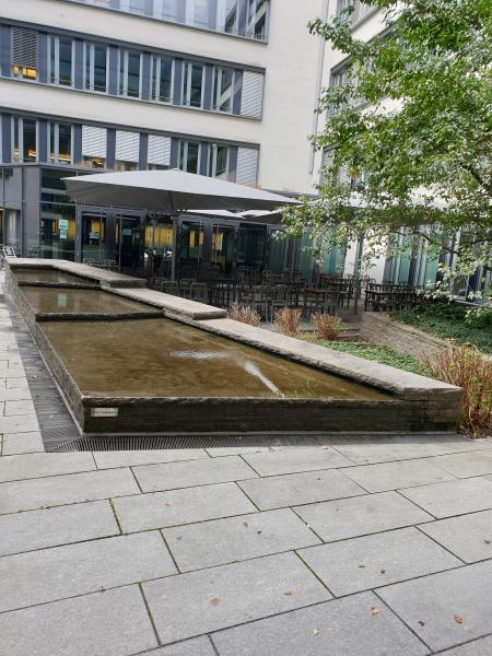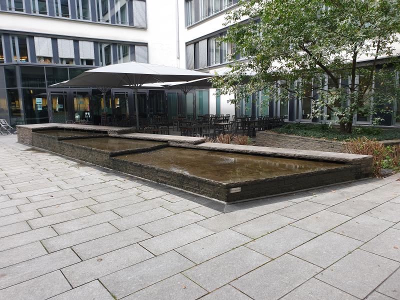 langgezogene Kaskadenbrunnen befindet sich im Innenhof eines Verwaltungsgebäudes