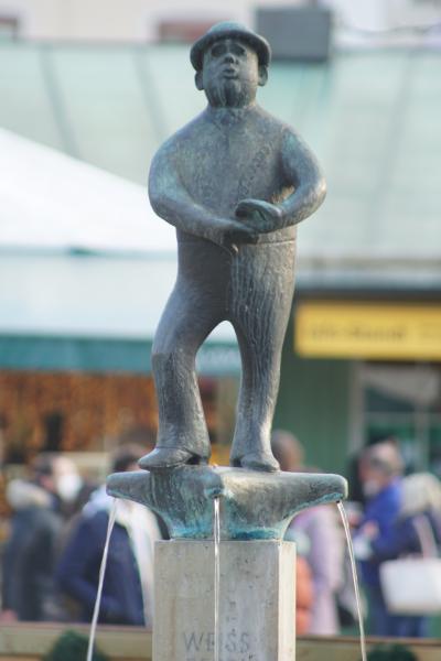 Brunnen ist dem Volkssänger Weiß Ferdl gewidmet. Eigentlich hieß er ja Ferdinand Weißheitinger, als er am 28.06.1883 in Altötting geboren wurde. Als Kind war er Sängerknabe in Altötting und Salzburg. Er absolvierte eine Lehre als Buchdrucker, bevor er zum ersten Mal in Regensburg als Komiker auftrat. Dann schob er seine Himmelfahrtsnase auch in das Münchner Volkssängergeschehen und wurde mit 23 Jahren am dortigen Platzl engagiert. Dort wirkte er dann über drei Jahrzehnte lang und wurde mit 38 neben Sepp Eringer zum Platzl - Direktor. Er spielte auch in vielen Heimatfilmen mit, und zahlreiche Tondokumente zeugen von seinem reichen Schaffen. Dazu verfasste er etliche Bauernstücke und Bücher. Sein Humor war immer geradeheraus, seine Kunst war die der Andeutungen. Jeder verstand, ohne dass etwas gesagt worden wäre. Anekdote: Weiß Ferdl trieb während der Nazizeit einmal drei Schweine auf die Bühne. Er kommentierte: "Die kleine da ist das Kind Mann, die mittlere ist die Frau Mann, und wegen dieser fetten Sau hab ich 8 Tage sitzen müssen". Jedermann wusste, was gemeint war ... Am 19.06.1949 starb er im Alter von 66 Jahren in München, ein Jahr nach Valentin. Begraben liegt er auf dem Sollner Waldfriedhof. Bereits vier Jahre später, 1953, errichtete man, im gleichen Jahr wie dem Valentin, auch dem Weiß Ferdl, dem beliebten Volkssänger und Humoristen, am Viktualienmarkt im Stadtbezirk 01 - Altstadt - Lehel ein Brunnendenkmal. Er ist, im Dachauer Bauerngwand, von dem Bildhauer Josef Erber gestaltet. Den Guß besorgte Hans Mayr aus München. Der Brunnenpfeiler ist aus Marchinger Kalkstein. Die Enthüllung des Brunnens fand zusammen mit der des Valentinbrunnens am 18.10.1953 statt, was ausgerechnet ein Kirchweihsonntag war. Die Aufschrift "Münchner Bürger ihrem Volkssänger" schmeichelt dem Weiß Ferdl sichtlich. Klein und gedrungen steht er auf dem Sockel. Spitzbübisch reckt sich unter dem flachrunden Hütchen seine Himmelfahrtsnase aus dem runden Kopf zum Alten Peter hoch, und über seine geschürzten Lippen scheinen die Töne seiner Lieder "Ein Wagen von der Linie 8..." oder das Lied "Vom Wunder der Münchner Weißwurst" in das Wasserbecken zu sprudeln. Etwas geniert, mit verlegen verschränkten Armen zeigt er sich seinen Bewunderern, die ihm frech in seine beiden Nasenlöcher gucken. Aufgedreht wurde der Brunnen damals von der Witwe, Bertl Weiß. Es handelt sich hier um einen - Trinkwasser führenden - städtischen Brunnen. |