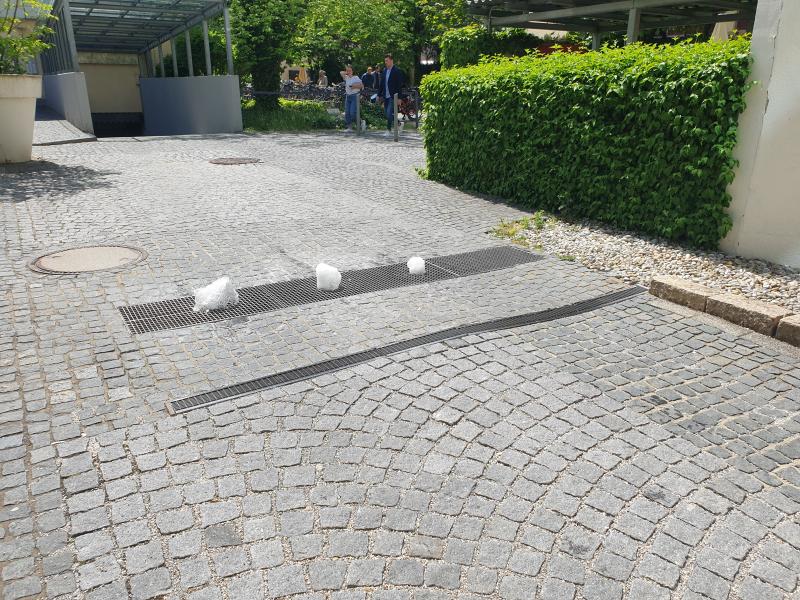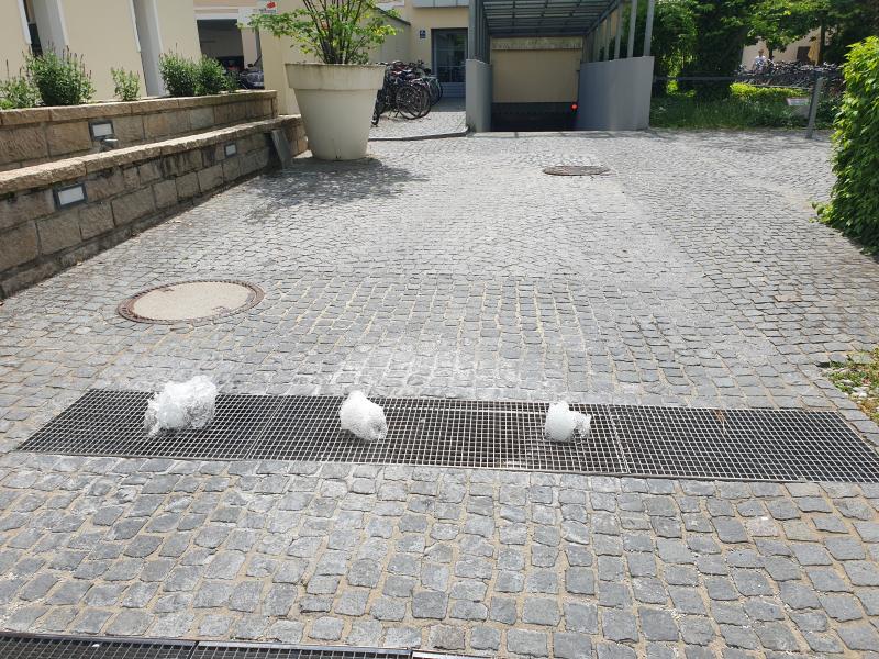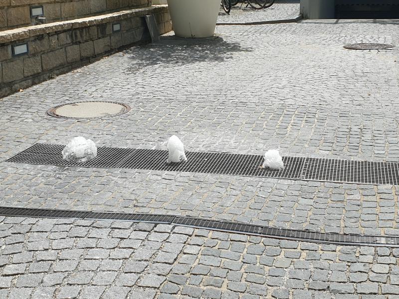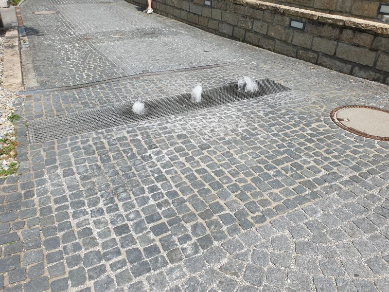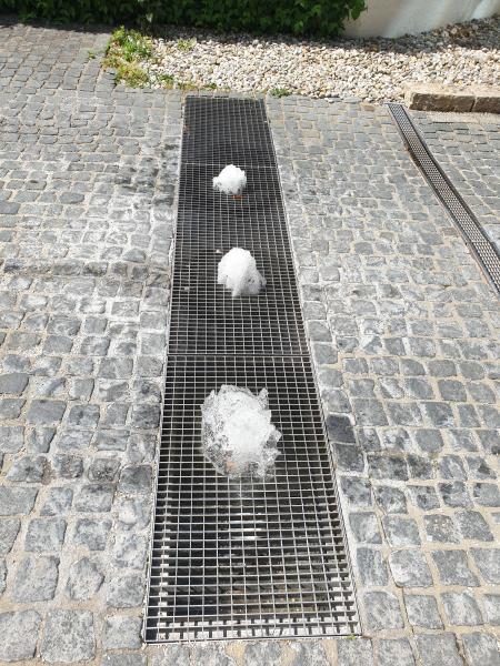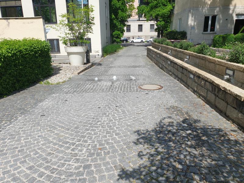 | Diese Brunnenanlage befindet sich an der Brienner Straße 45a im Stadtbezirk 03 - Maxvorstadt. Es handelt sich um drei Fontänen, die quer über eine Garageneinfahrt führen. Sehr skurril das ganze! Wenn jemand hinein oder hinausfahren möchte, wird durch Tor - und Schrankensteuerung die Fontäne kurzzeitig abgeschaltet bis das Fahrzeug die Stelle passiert hat. Mir wurde gesagt, dass die Pumpe nicht mehr die jüngste ist und die Fontänen früher bis zu 50 cm hoch waren. Dadurch, dass die Pumpe nicht mehr die volle Leistung bringt, halten sich die Fontänenhöhen in Grenzen. Dankeschön an dieser Stelle an den Haustechniker der Gebäude, der die Anlage extra für mich aktiviert hat! Hier handelt es sich um eine private Anlage. |