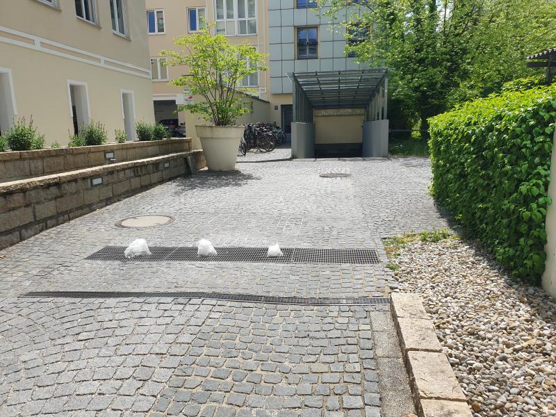 sieht man das Garagentor der Tiefgarage und die Einfahrt in den daneben
