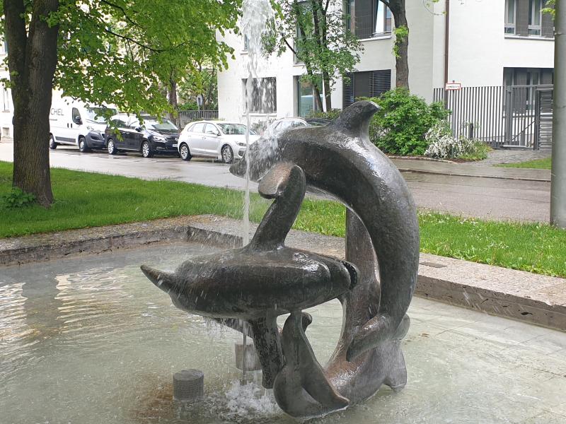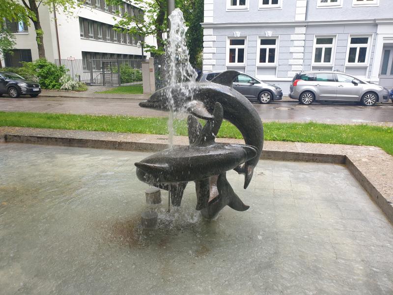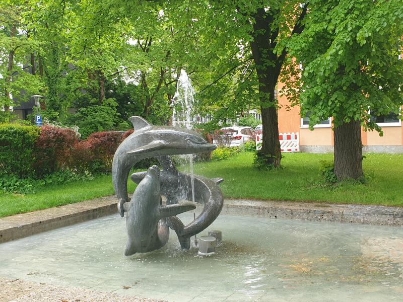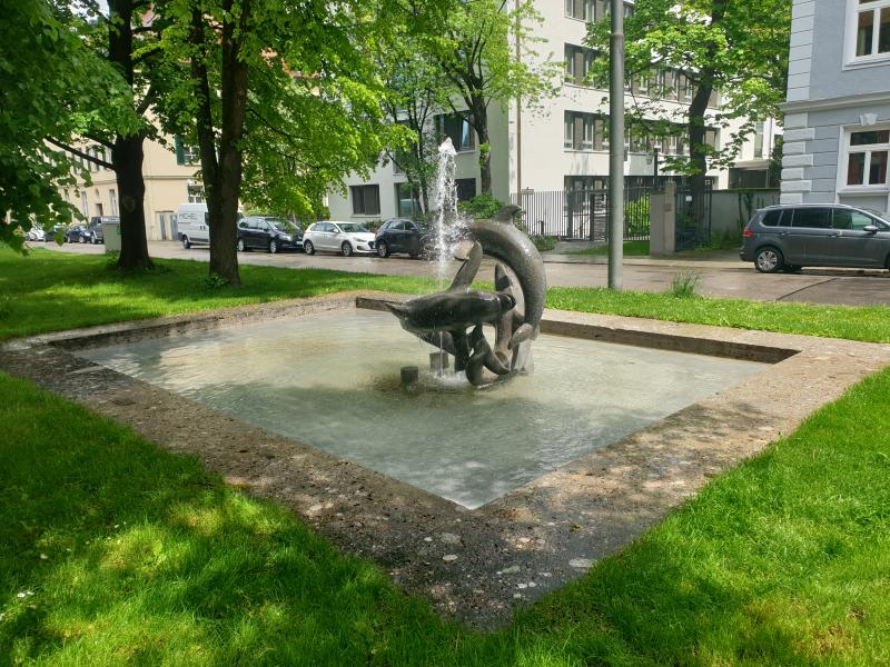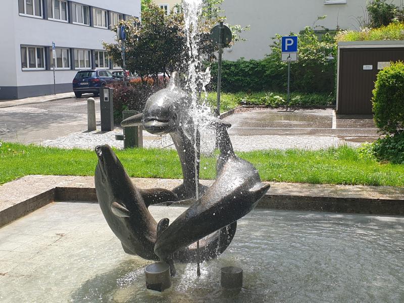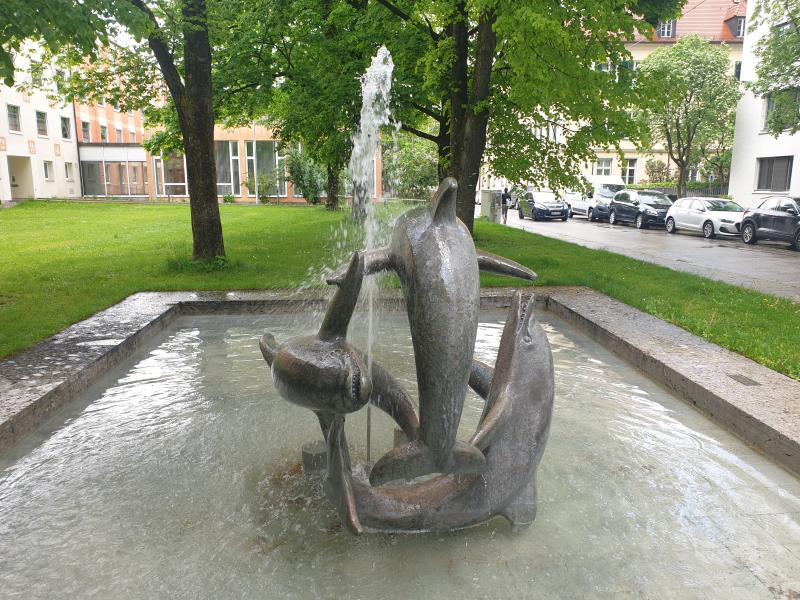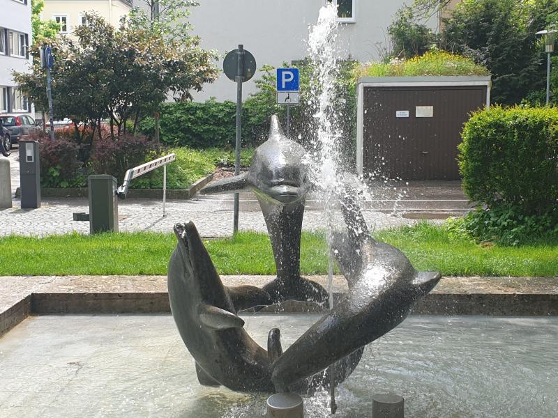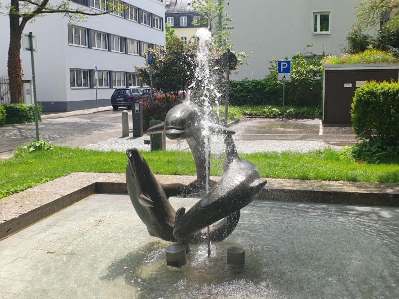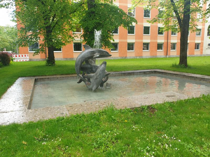 "Delphinbrunnen" befindet sich vor dem Gebäude des bayerischen