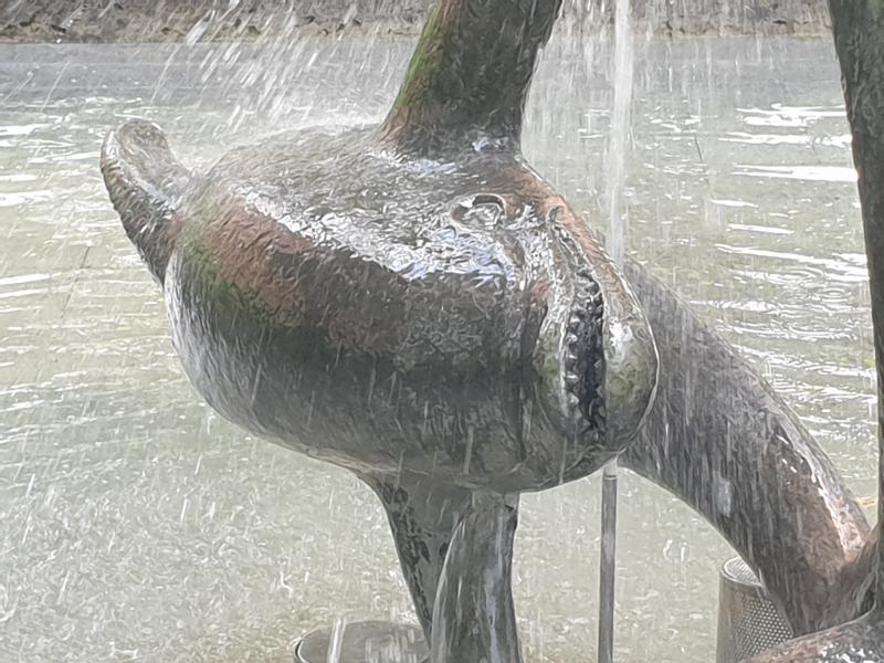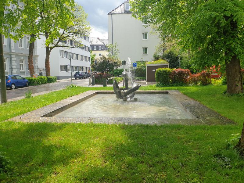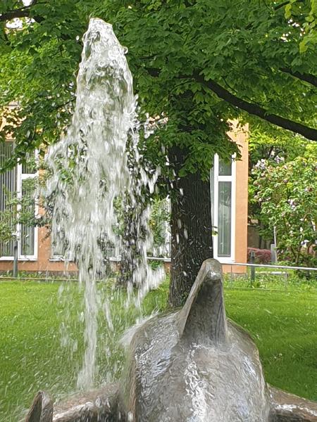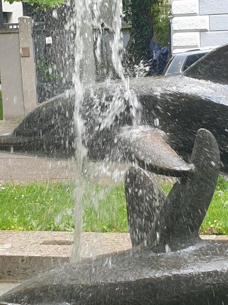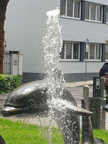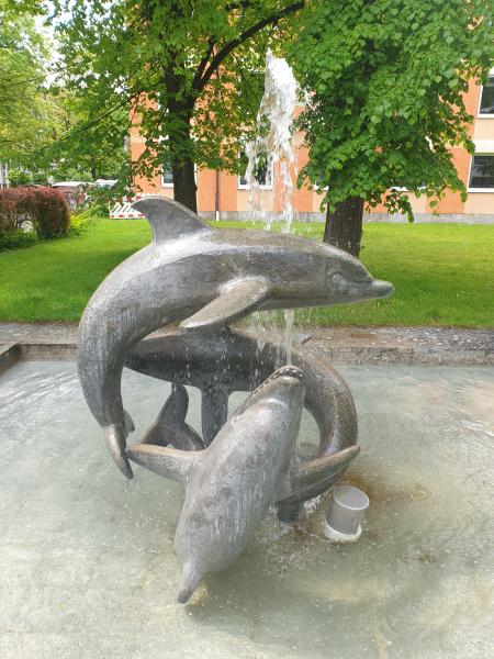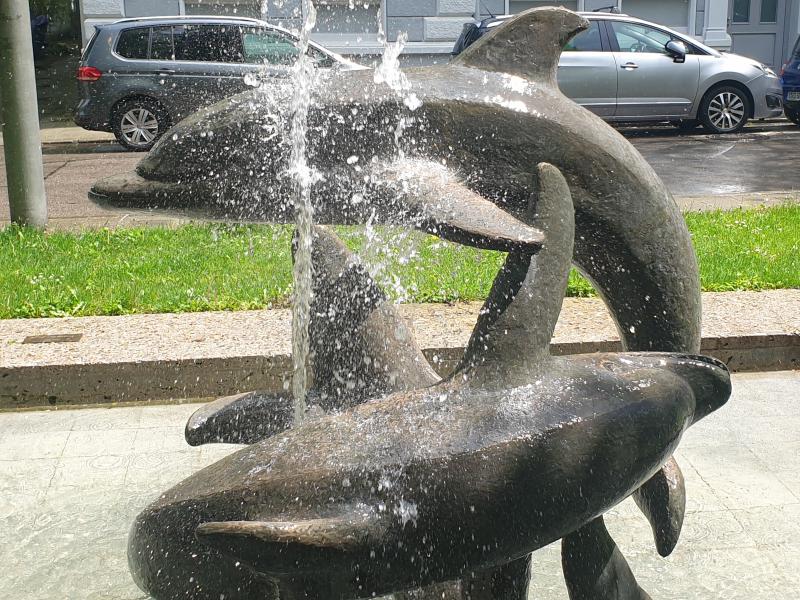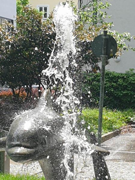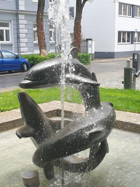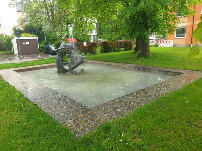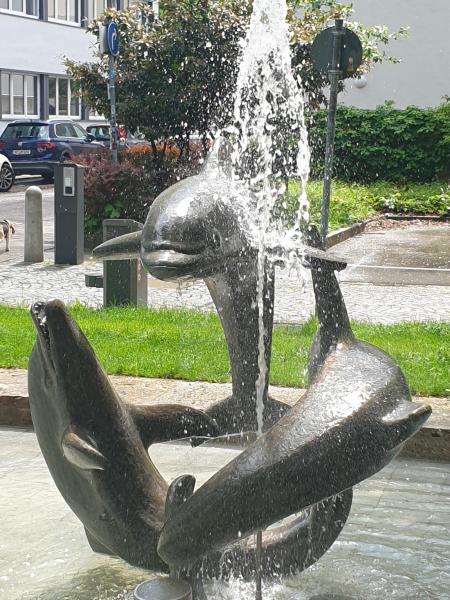 "Delphinbrunnen" befindet sich vor dem Gebäude des bayerischen