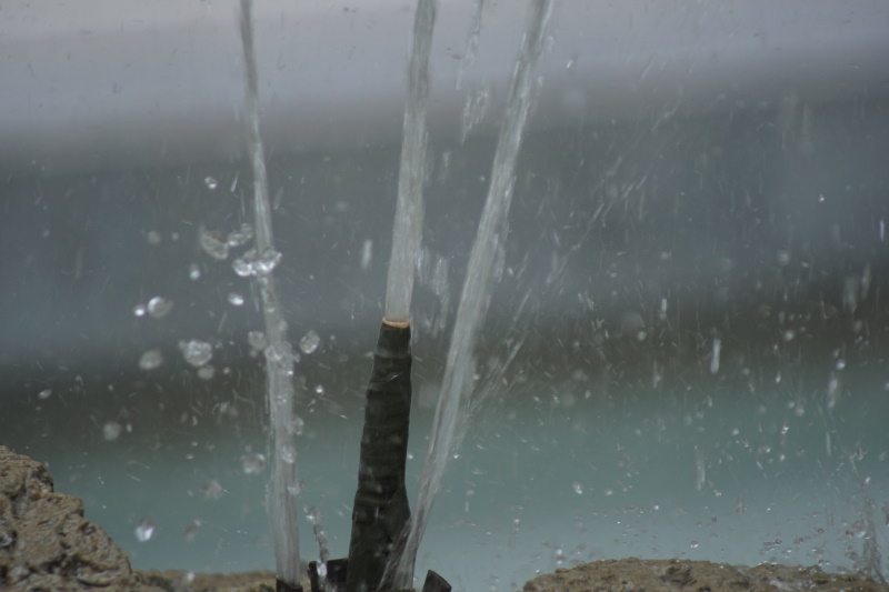 sodass eine Fontäne hochsprüht; mit einem Dreizack bewaffnet
