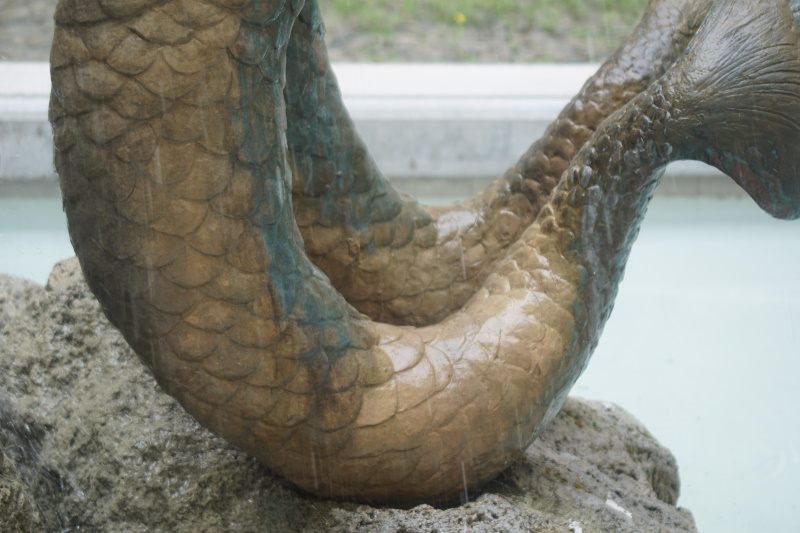 mit doppelt geschupptem Fischschwanz - scheint aus dem Wasser zu schnellen,