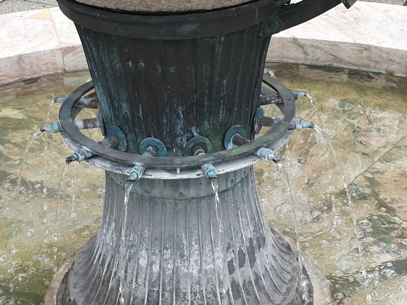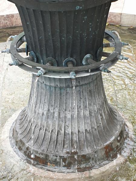 sein Glück". Inmitten eines aus Marmor, Bistritzki schreibt hier von Tuffstein, gefertigten kreisrunden Beckens steht eine aus Kupferblech angefertigte, in zwei Segmente geteilte kannelierte runde Vase. An ihr ist auf halber Höhe eine umlaufende Speiche montiert, daran sind 12 Röhrchen befestigt, die direkt aus dem Inneren der Vase kommen. Aus diesen Rohrstutzen quillt das Wasser dem staunenden Brunnenbetrachter entgegen, sogleich unterbricht die Schwerkraft diesen Vorgang schlagartig, sodass es einem Bogen beschreibend, weiter in das kreisrunde Becken fällt. Dieses nimmt das kühlende Nass auf, bis es durch ein engmaschiges Lochblech am Rand des Beckens wieder in den Wasserkreislauf zurückgeführt wird. Auf der Vase, die wie ein zweiseitig offener Trichter geformt ist, steht obenauf, durch ein von Christian Steinicken, geschickt konstruiertes Metallgerüst zentriert, die große Weltkugel. Sie ist über und über mit kleinen unterschiedlich gefärbten Mosaiksteinchen bestückt. Aus ihrer Anordnung heraus, lässt sich die Position und Form der einzelnen Kontinente einsehen. Da sich die Position des Brunnens auf der Fotoansicht in Bistritzki zu dem Aussehen der aktuellen Situation und auch die Gestaltung rund um den Brunnen verändert haben, ist davon auszugehen, dass zwischen den 1970er Jahren und den 1990er Jahren eine Restaurierung stattgefunden haben muss. Der Wasserkranz unterhalb der Kugel bestand vormals aus vielen kleinen Düsen, die auf einem Rundrohr nach oben zeigend angebracht waren. Über den Düsen, mind. 50 Stück, die das Wasser in einem Bogen nach aussen heraus drückten, befand sich eine Metallplakette, auf der die Inschrift in schwarzen Lettern aufgebracht war. Der Grundstock ragte nicht wie auf der aktuellen Fotoansicht zu erkennen aus dem Wasser heraus. |