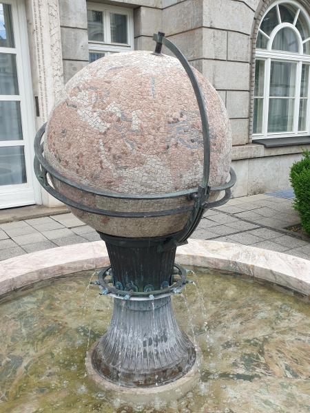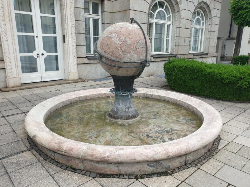 "Globusbrunnen" mit einer Weltkugel auf einem Trichtersockel