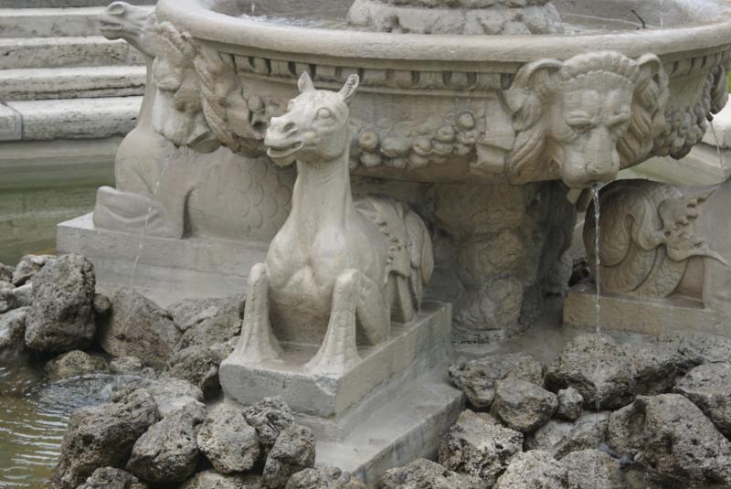wiehernd vier Hippocampen, ebenso aus Marmor, der anlässlich der