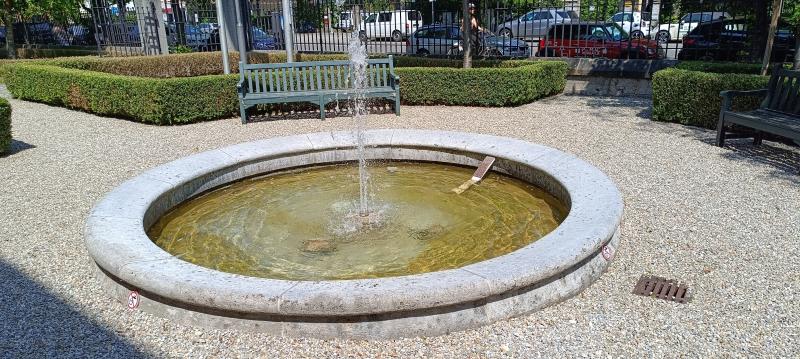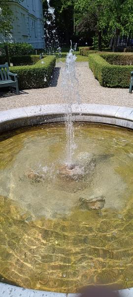 runde Brunnen befindet sich vor einem Gebäude in der Nymphenburger