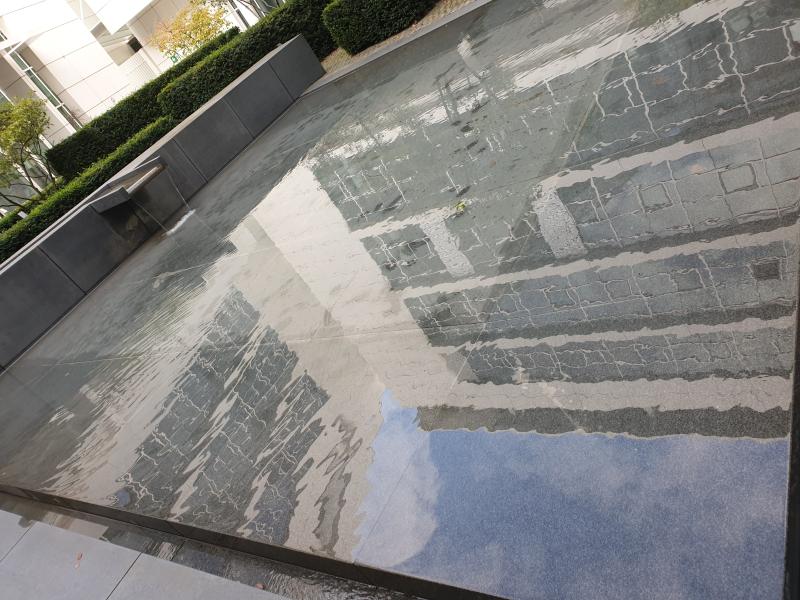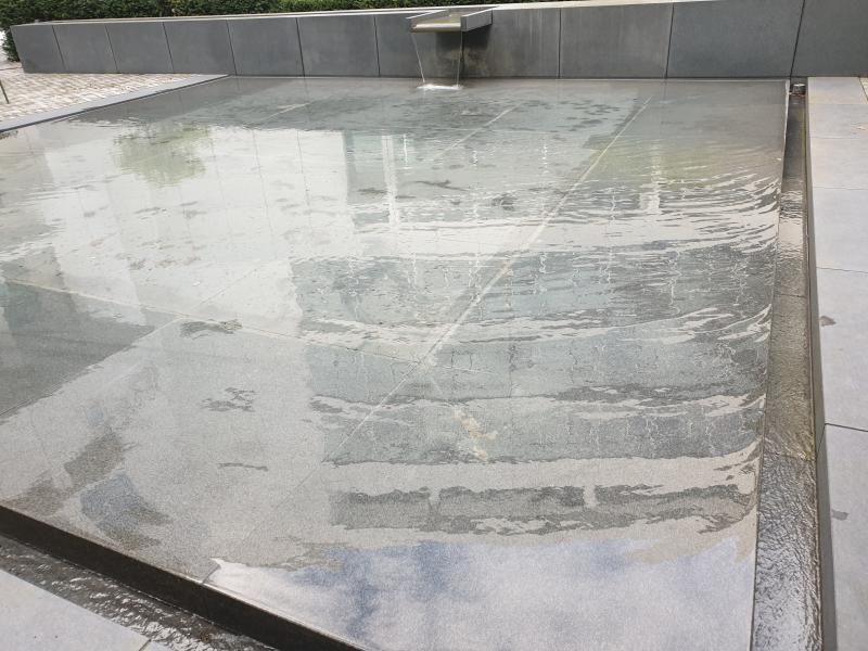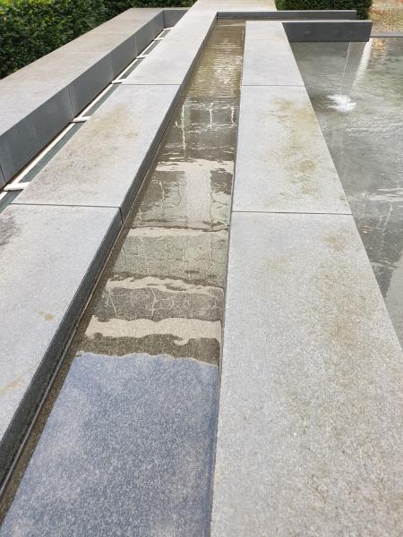 Leise und beruhigend plätschert das Wasser auf eine große Steinplatte,