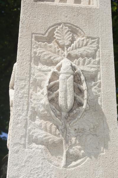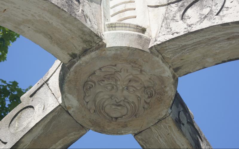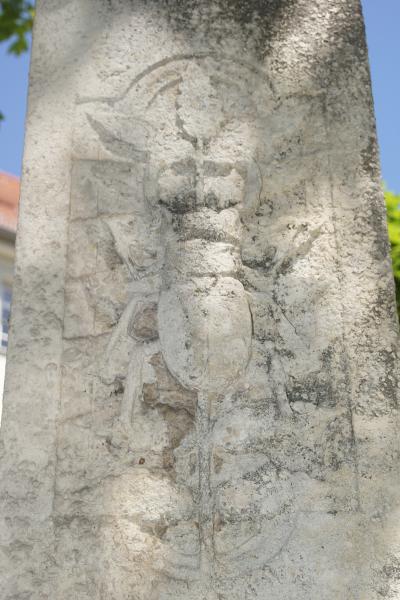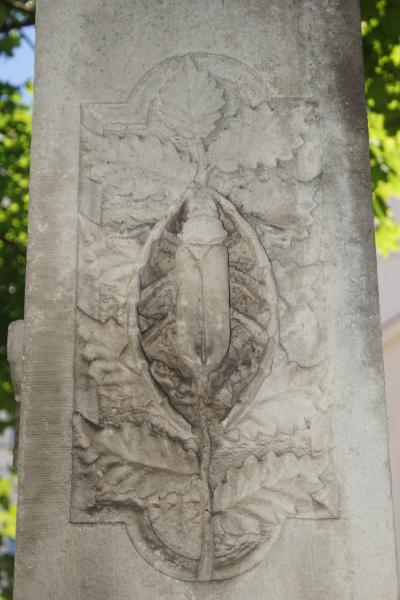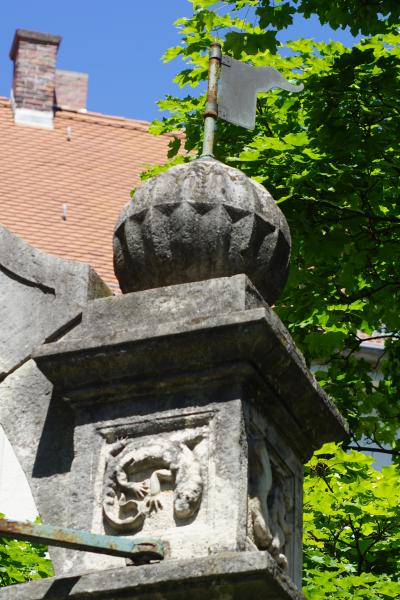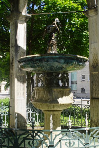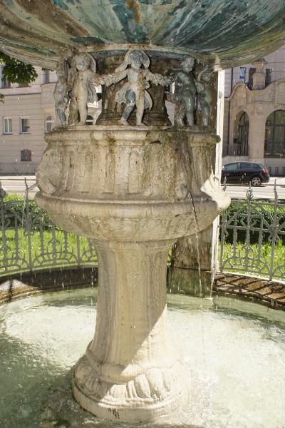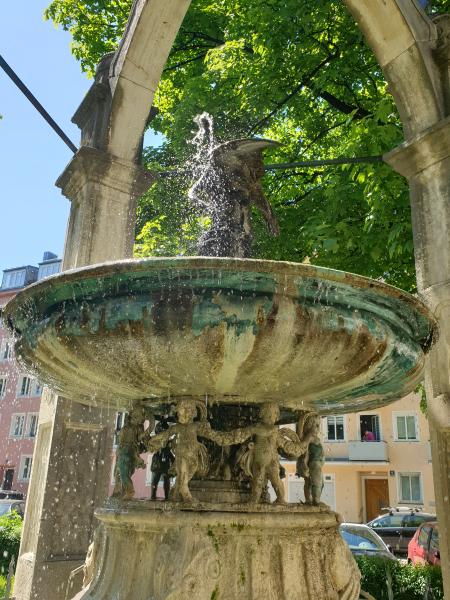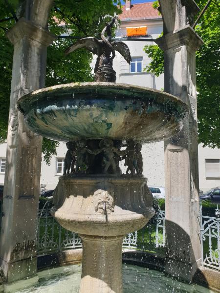 von Joseph Floßmann (1862 - 1914) entworfen und gehauen. Die Plastiken wurden von Adalbert Brandstetter gegossen. Der Brunnen ist mit einem Baldachin aus Kelheimer Muschelkalkstein überbaut. In der Mitte des Baldachins, der von vier quadratischen Säulen getragen wird, befindet sich eine große Kupferschale, die unterhalb von 12 kleinen Figuren getragen wird. Diese wiederum sind auf einem weiteren Kalksteinsockel montiert, in den vier kleine flache Köpfe modelliert sind. Aus deren Mäulern fließt das Wasser in das Hauptbecken. In der Mitte der Kupferschale steht eine Art Kelch, dessen Kappe von einer Kugel abgedeckt wird. Auf ihr hockt ein Reiher, der seine Schwingen geöffnet hat und mit einem Aal kämpft. Wasser schießt dabei aus dem Maul des Aals und rinnt über die ganze Plastik nach unten in das kupferne Becken. Auf der Wölbung des Steinbaldachins steht ein kleiner Bursche, der in der linken Hand die drei Lilien der Au und mit der rechten Hand das Münchner Stadtwappen hält. Die vier Steinsäulen sind reichlich mit Tieren und Pflanzen des Waldes verziert. Das Fundament ist kreisrund angeordnet und wird von einem Zaun, der zwischen den vier Säulen montiert ist, eingefasst. Es handelt sich bei diesem Brunnen um einen Trinkwasserbrunnen, dessen Mittelstück in der Winterpause angedeckt wird. Das Monument ist aus Beton gefertigt. Es handelt sich hier um einen städtischen Brunnen. |
