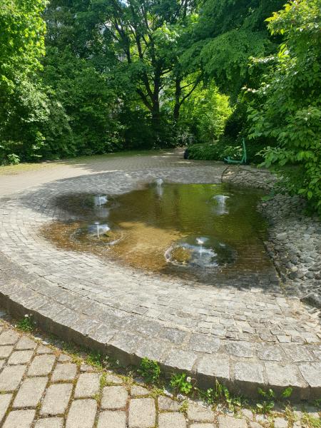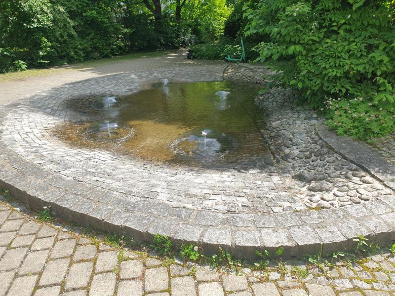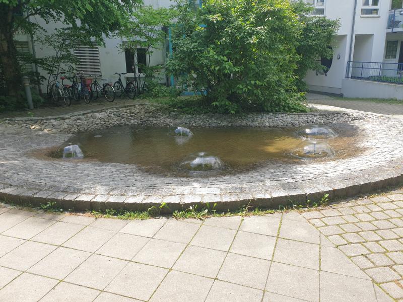 plätschert der Brunnen am Weg der Wohnanlage. Es handelt sich hier