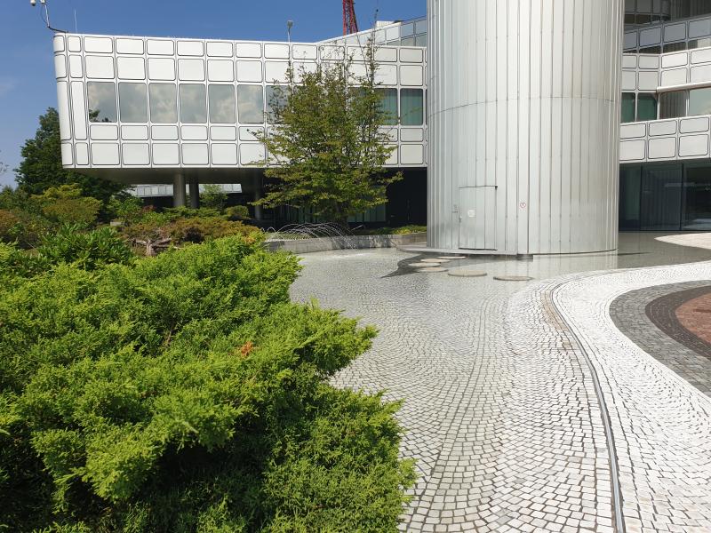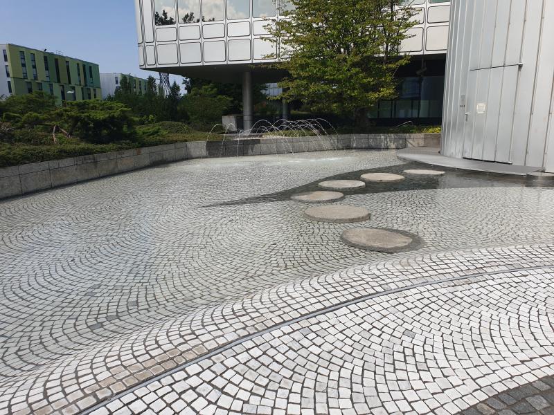 eine von drei Brunnenanlagen, die sich vor einem Hochhaus an der Arabellastraße