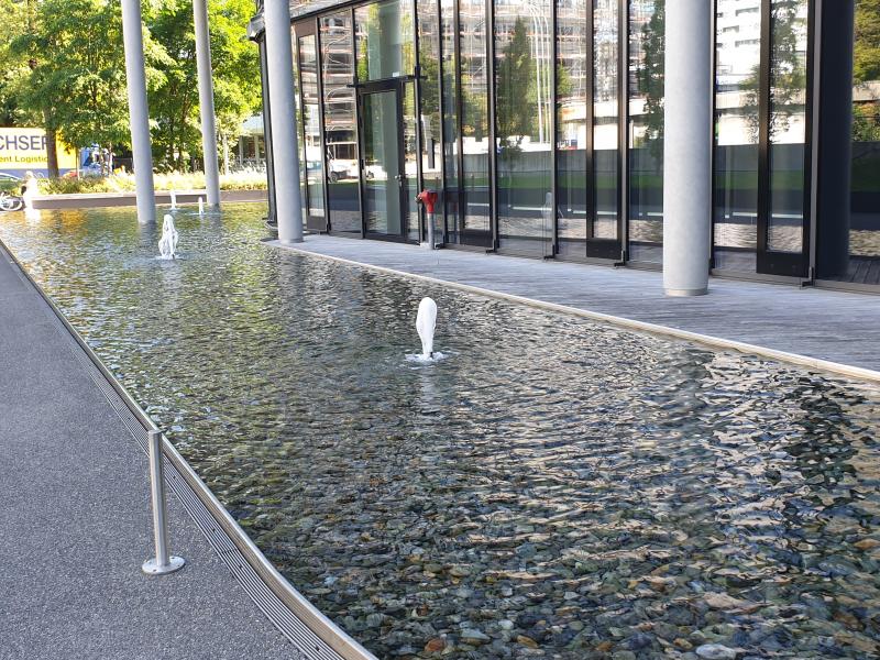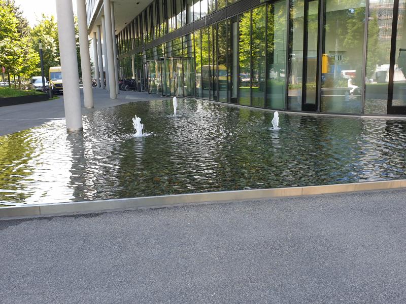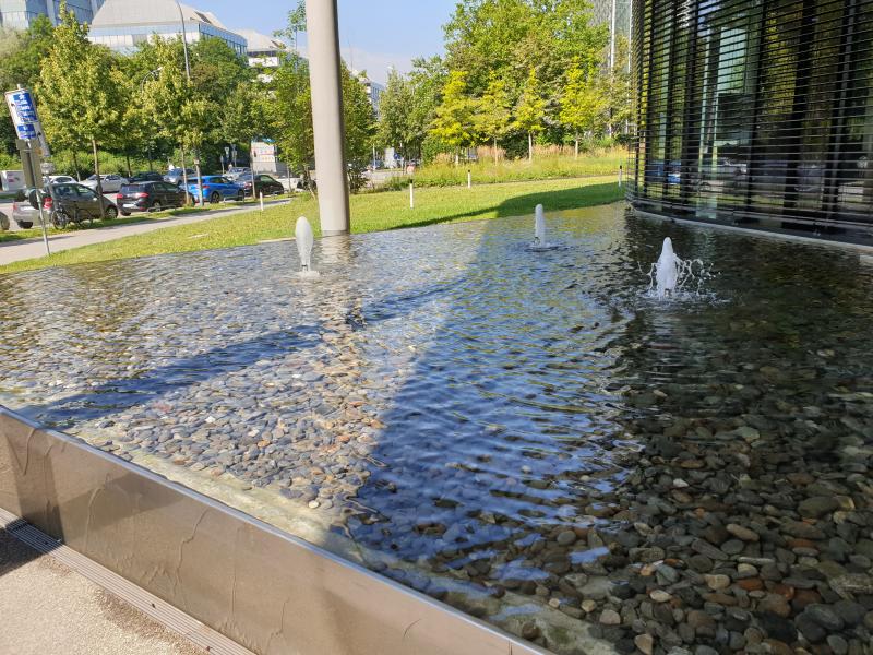 das Wasser aus kleinen Fontänen in mit Kies gefüllte Becken.
