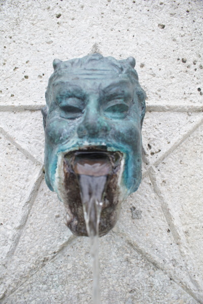 Säule ziert ein gehörnter Faunenkopf mit Wasserauslass auf einem