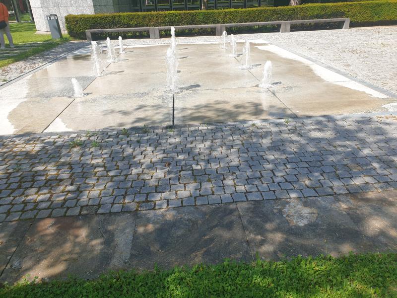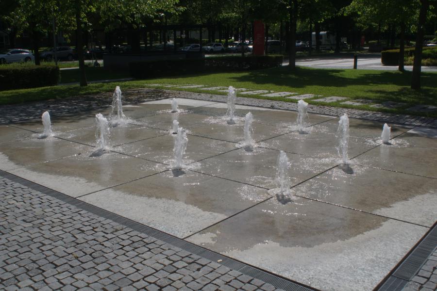 Neuperlach im Stadtbezirk 16 - Ramersdorf - Perlach. Es handelt sich hier um 12 Bodenfontänen, die an den Schnittpunkten von 20 Steinplatten verbaut wurden. Die äußeren Plattenreihen bilden einen Rahmen, in dem sich die Fontänen befinden. Die Anlage wurde 1977 von Karl Kagerer entworfen und errichtet. Die Platten wuden vom Natursteinbetrieb Martin Feicht, München, eingebaut. Das Fontänenfeld hat eine Fläche von 45 m². In Betrieb genommen wurde die Anlage am 17.10.1977. Anzumerken sei noch das Hinweisschild "Kein Trinkwasser - Baden verboten!". Hier handelt es sich um einen privaten Brunnen. |