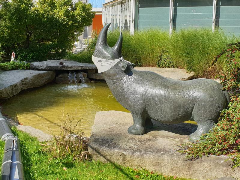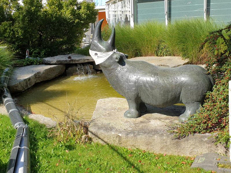 muss sogar das bronzene Nashorn einen Mundschutz tragen :-) Um den Brunnen