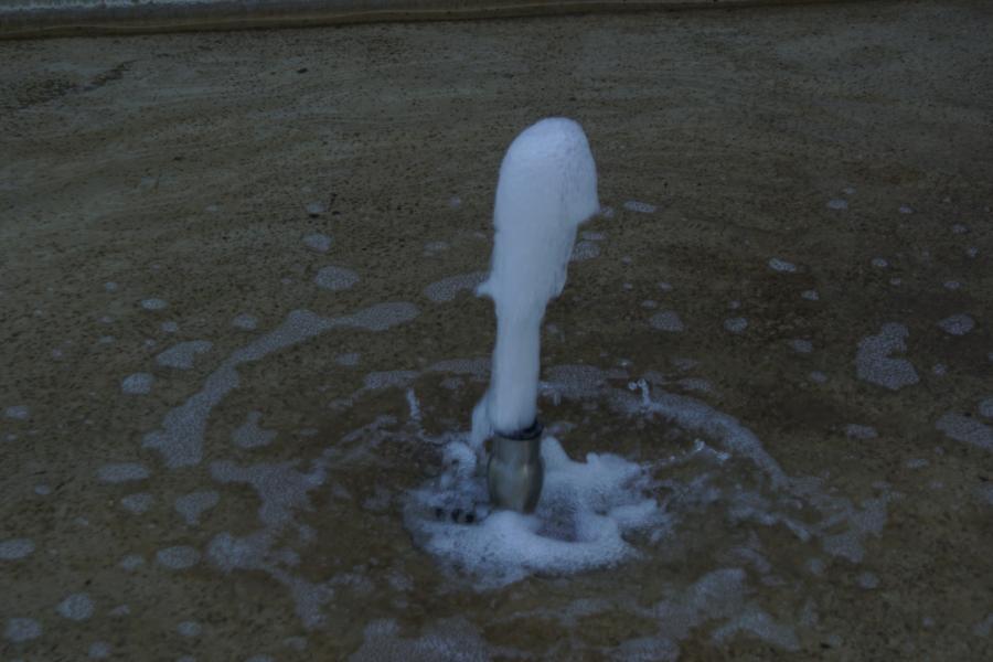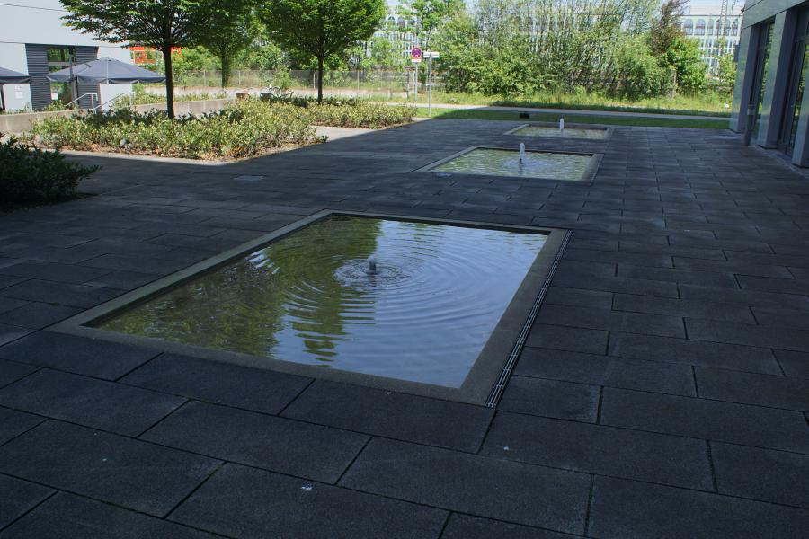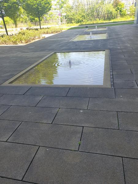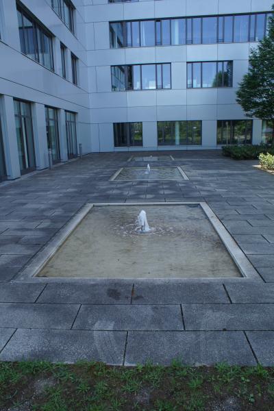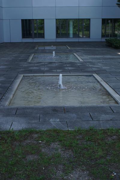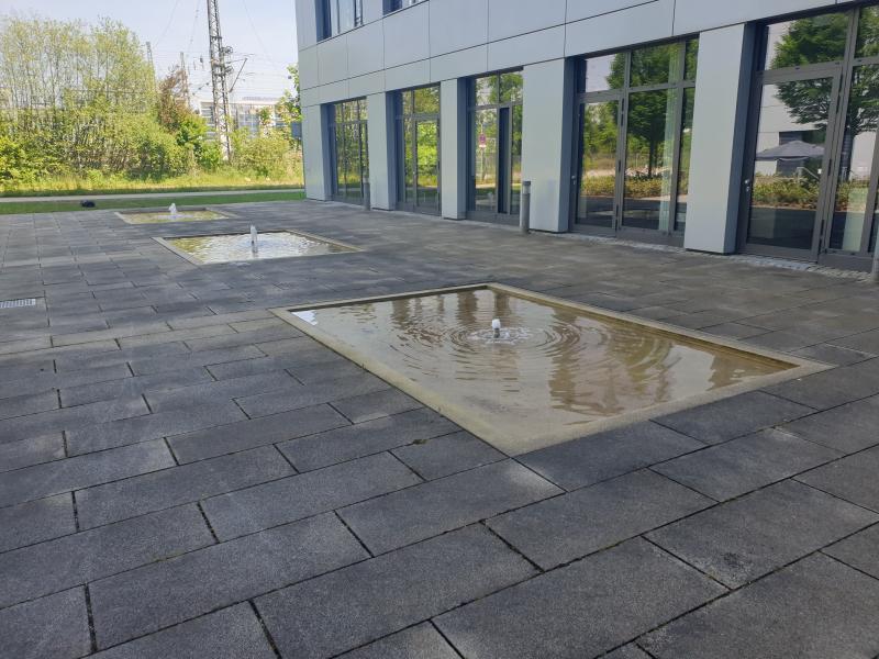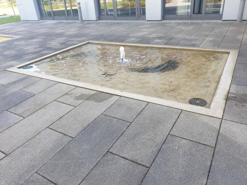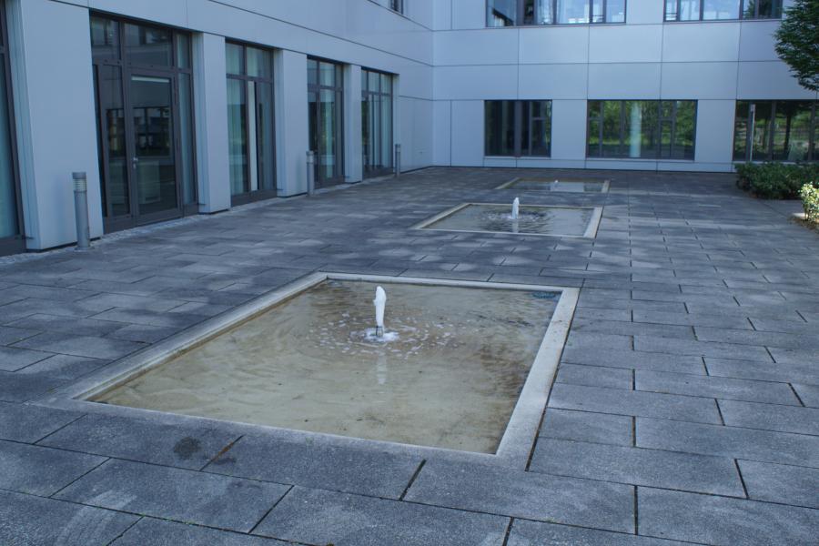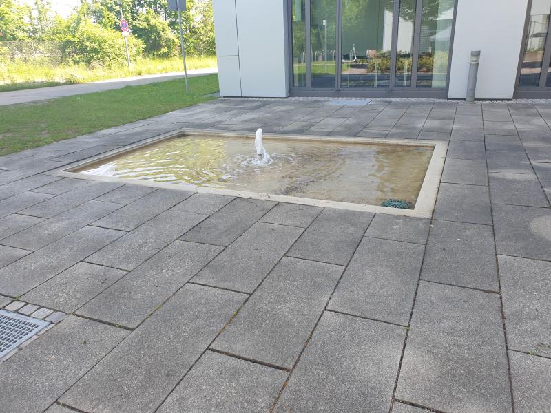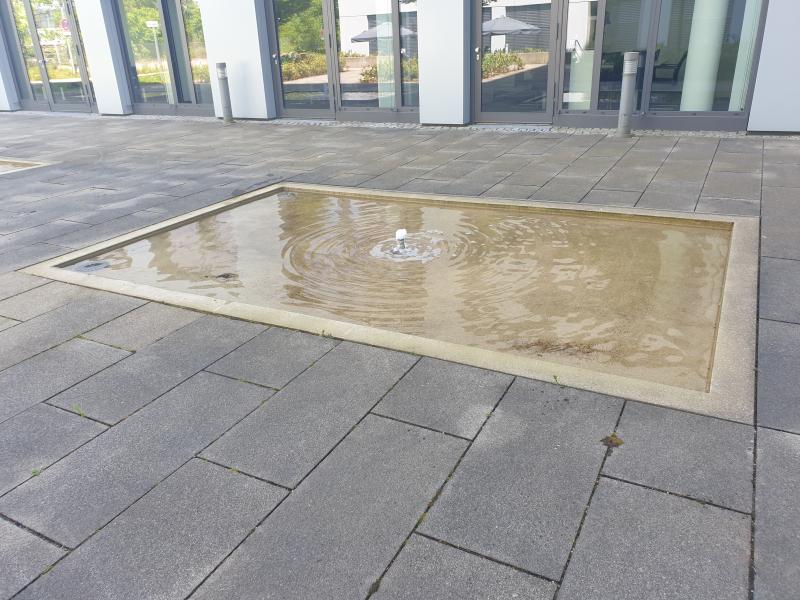 Brunnenanlage befindet sich auf der Rückseite eines Geschäftsgebäudes