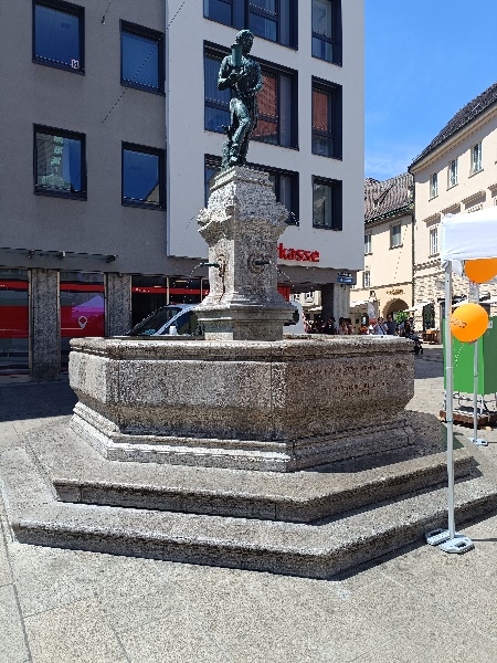 Pokal in seiner rechten Hand hält. Das Wasser des Goldschmiedebrunnens