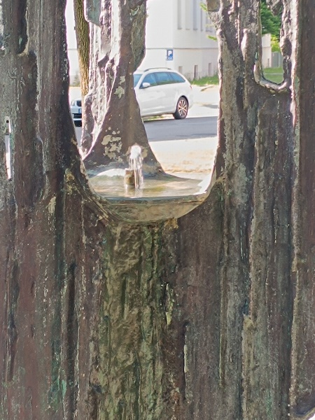 wurde aus Kunststein gearbeitet; auf einer kleinen Bronzetafel am Beckenrand