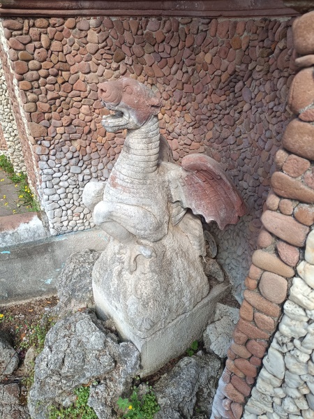 Dach, sitzt auf einem kleinen Felsen ein etwa ein Meter hoher Drache aus