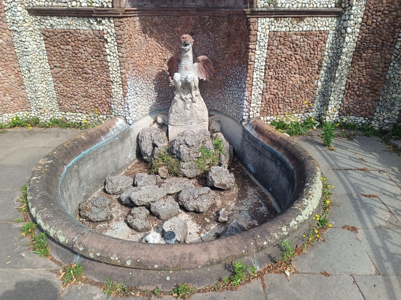 speit der kleine Drache Wasser in das ovale Becken. Rechts und links der