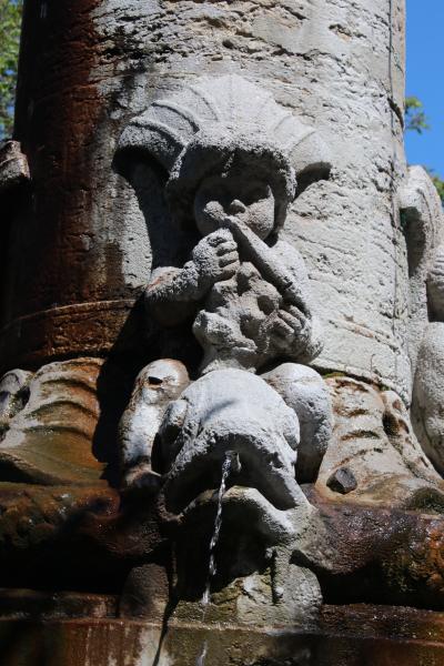 Vier auf Delphinen reitende Putten krönen den Sockel. Sie sind Symbole