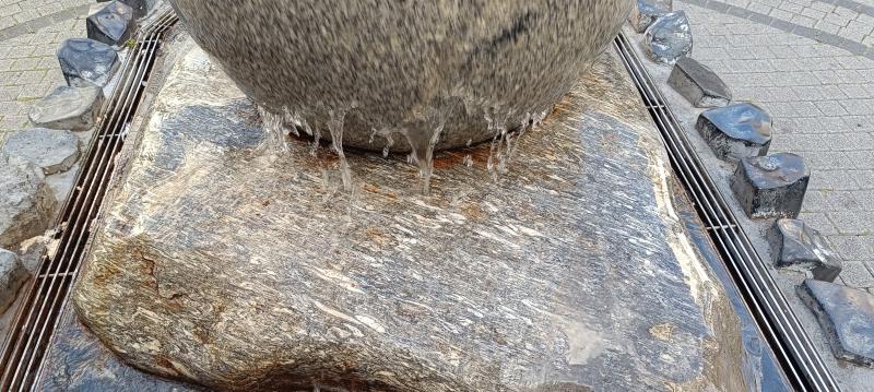 versetzt worden. Vor dem "Kugelbrunnen" ist ein Kanaldeckel in das Pflaster eingelassen. Auf diesem ist zum einen der Hinweis auf die Stifter des Brunnens zu finden: "Dieser Brunnen wurde gestiftet von der Anliegergemeinschaft Calwer Strasse". Zum anderen enthält der Text Informationen zum Brunnen selbst: "Striegauer Granitkugel Ø 1000 mm, fein poliert und gewuchtet, Gewicht ca. 1,5 t, schwimmend auf Granitbasis Findling Gewicht ca. 2,0 t.". Umrahmt wird der "Kugelbrunnen" von einem Kranz aus Basaltgestein. |