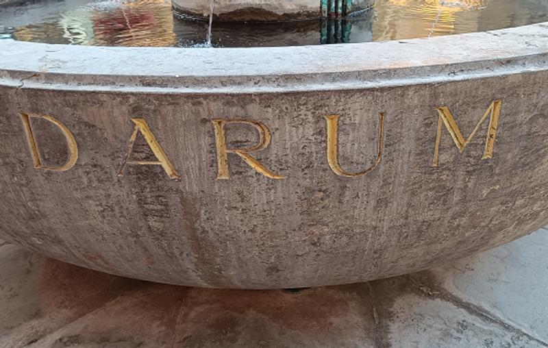 Schale aus Muschelkalk mit der Inschrift „Ernte wächst nur