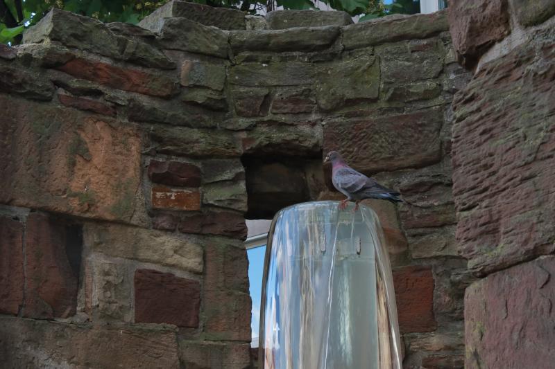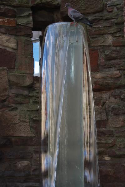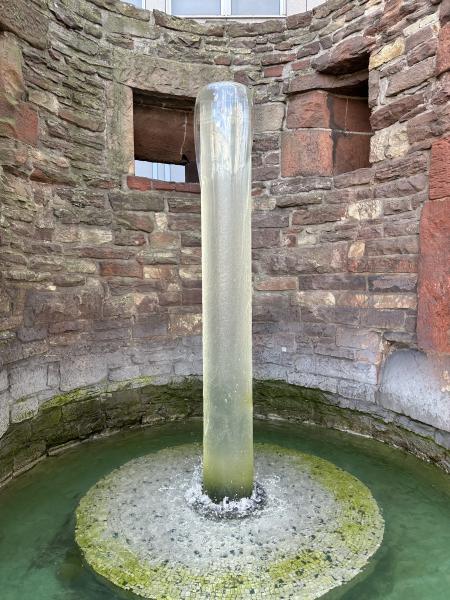 In seine Wölbung ist ein Wasserspiel mit einer hohen Kunstglassäule