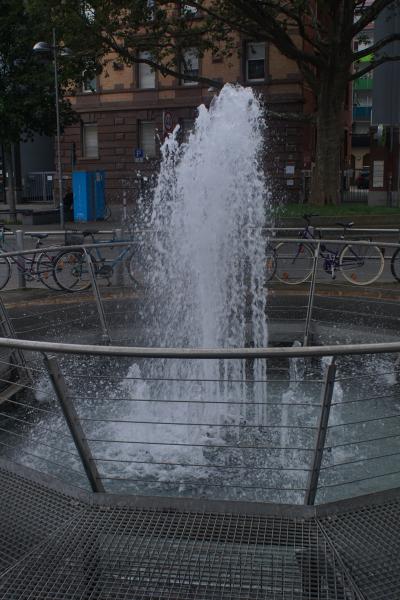 kurzzeitig eine mehrstufige Wasserfontäne. Sie erhebt sich aus einem flachen polygonalen Wasserbecken, das teilweise begehbar mit Edelstahlrosten abgedeckt ist. Das bewegte, rauschende Wasser ist als optischer und akustischer Hinweis auf den seitlich darunter fließenden Nesenbach gedacht. Die Anlage wurde 2003 in Betrieb genommen. |