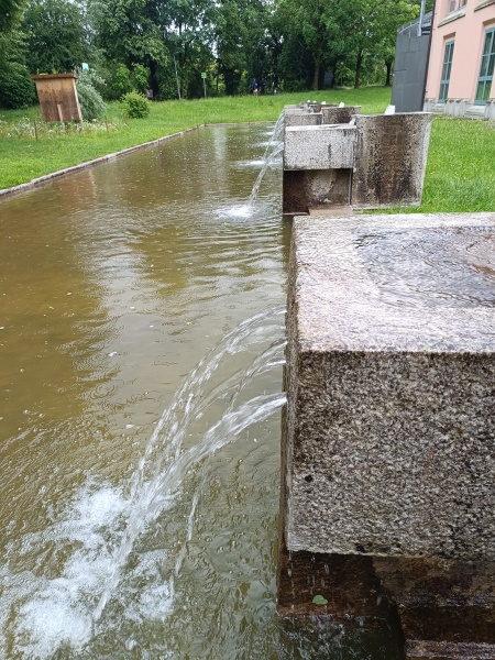 langen Beckenrandes sprudeln und das Wasser fließt durch eingearbeitete