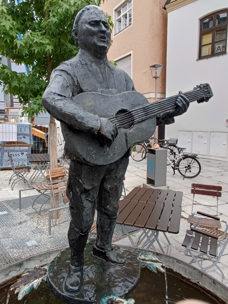 Brunnen auf dem Münchner Viktualienmarkt - dem Volkssänger Roider