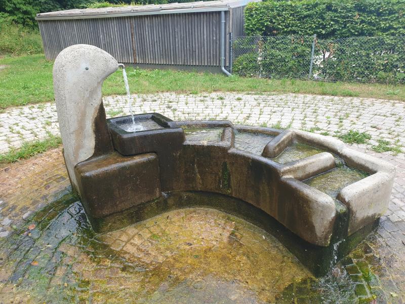 kleine Brunnen steht in einer Grünanlage in der Nähe einer Kindertagesstätte