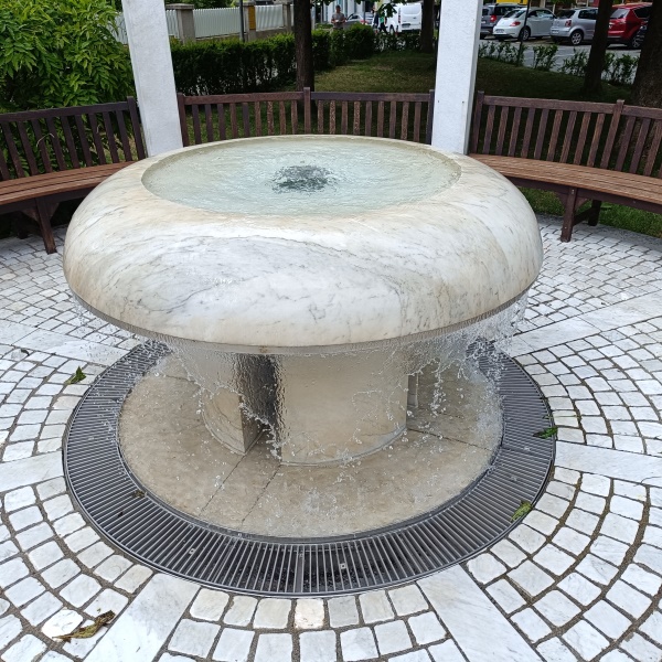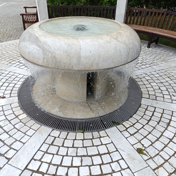 Er besteht aus Marmor und steht in der Mitte einer Pergola aus Stein.
