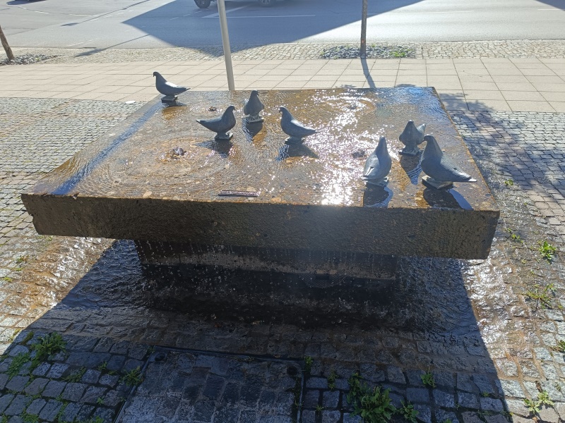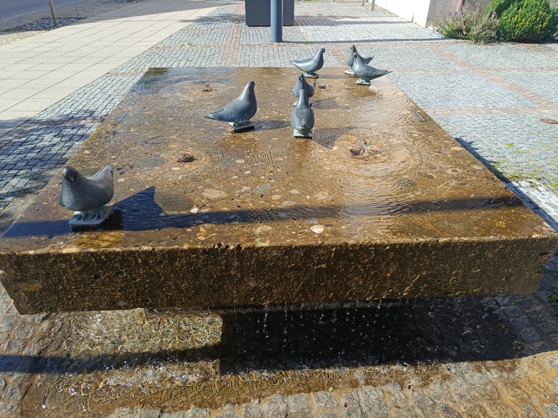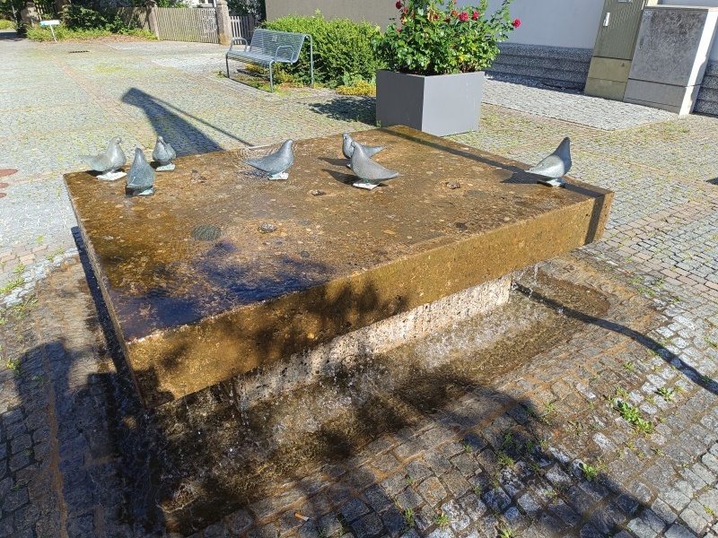 das Wasser austritt, sitzen sieben bronzene Tauben. Gerade so, als würden