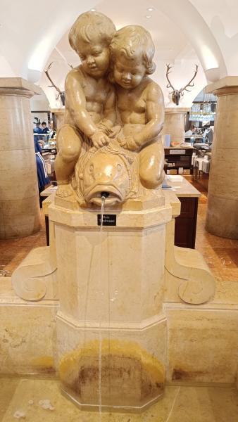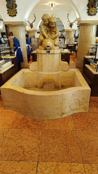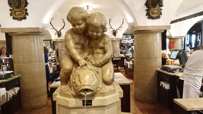 schöne Fisch - Brunnen steht mitten im Verkaufsraum des Delikatessengeschäfts