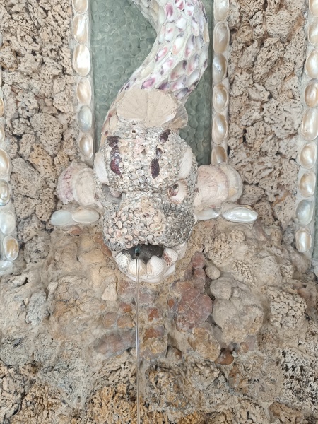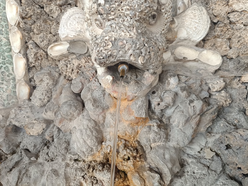 kleinen wasserspeienden Fischfigur. Alle vier Brunnen sehen gleich aus.
