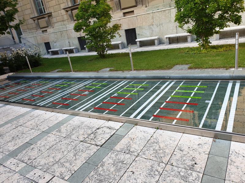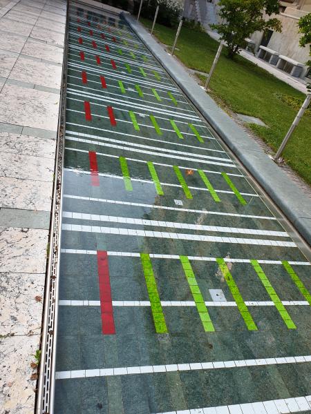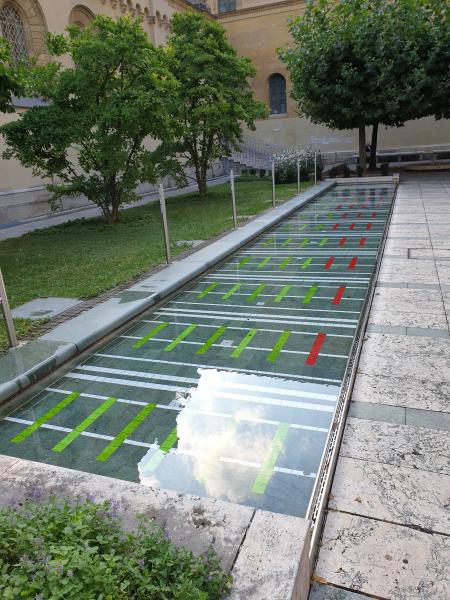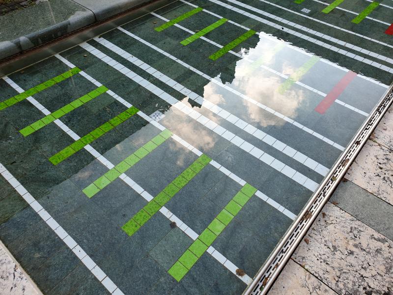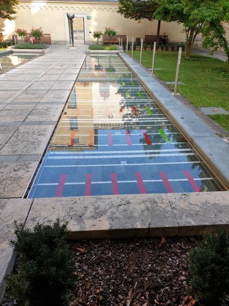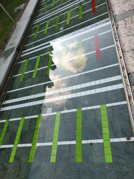 In den flachen Wassern mit den vermeintlichen Stufen aus bunten Glasstreifen,