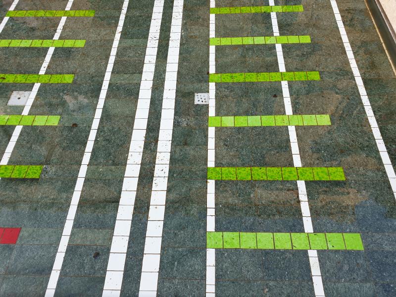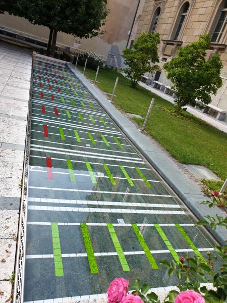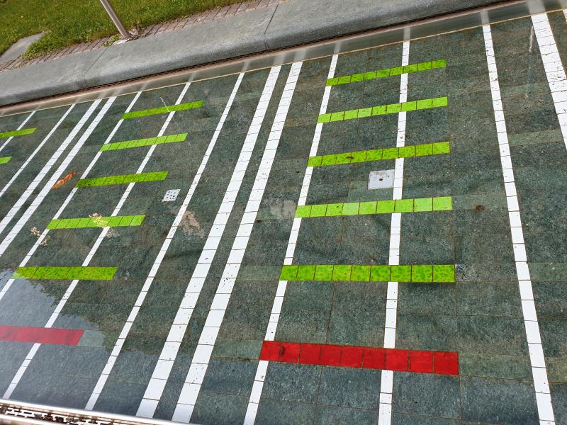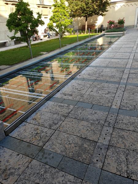 Gneisplatten (von Verde Andeer Ortho Quarzit), auf denen Glasstreifen