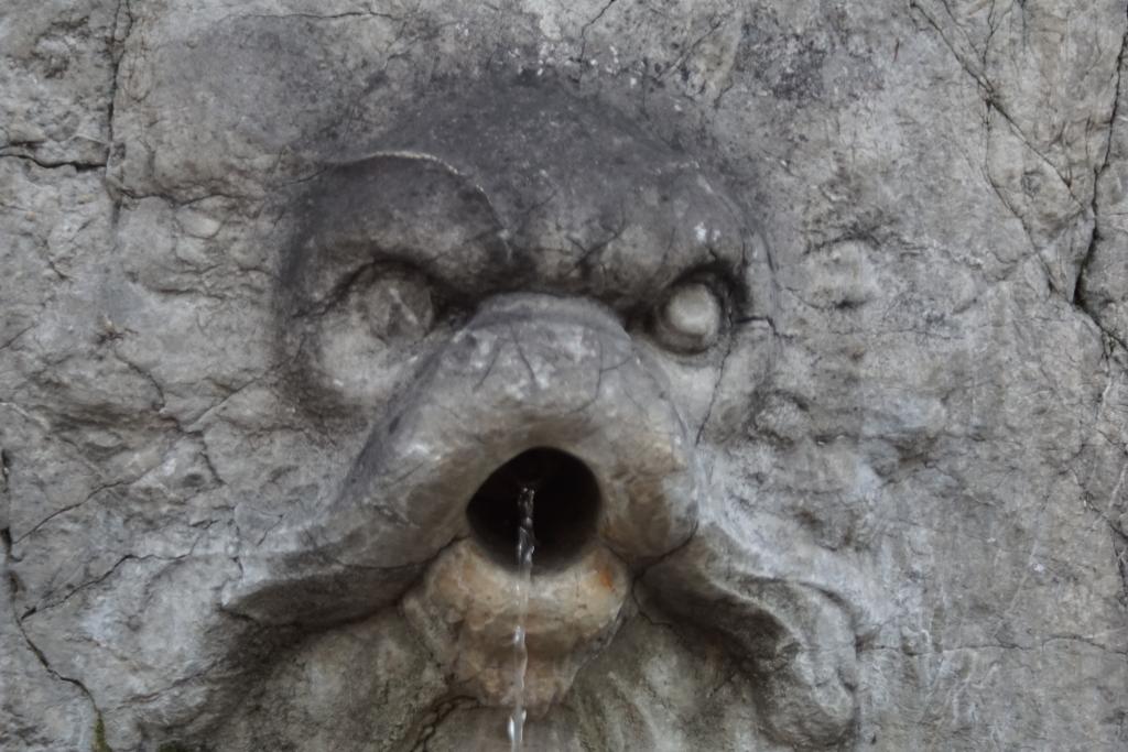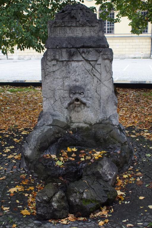 01 - Altstadt - Lehel. Das kleine Monument besteht aus drei großen Felsblöcken, die, schlicht übereinander gestellt, eine exakte Form ergeben. Der Unterbau ragt etwa 40 cm ins Erdreich, aus dem drei kleinere Granitfelsbrocken vor dem Brunnen herausragen und eine Art offenes Becken bilden. Über dem untersten Sockelansatz steht einer der drei Blöcke, zu einer Rechtecksäule geformt. Auf der Vorderseite dieses Brockens ist auf ca. 70 cm Höhe ein Löwenkopf aus dem Stein heraus modelliert. Aus dessen Maul fließt das Wasser im kleinen Bogen heraus, und direkt im Erdreich davor, zwischen den kleinen Granitsteinwürfeln, versickert es schon wieder. Als Krönung steht ein weiterer Natursteinblock auf der Anlage, mit Blattwerk verziert und in die Front gemeißelten Jahreszahl. Die lateinischen Ziffern MDCCLXXXX bilden die Zahl 1790. Hierbei ist nicht bekannt, ob es sich um das Jahr der Aufstellung handelt, oder eine andere Begebenheit der Anlass war. Viele der feinen Nuancen am Steinkörper sind im Laufe seines langen Lebens abgeplatzt und abgebrochen. Über das genaue urspüngliche Aussehen kann daher nur spekuliert werden. Der Brunnen stand einst in der Residenzstraße, etwa einen Meter leicht schräg vor der Westfassade der Residenz, drei Steinbodenplatten breit neben dem auf der linken Seite postierten Löwen am Portal zum Kapellenhof. Die einzelnen kleineren Felsblöcke vor dem Brunnen sind zu jener Zeit nicht beigestellt, und der Brunnen wurde auch nicht mit Wasser beschickt. Zu vermuten ist, dass dies nur ein vorübergehender Standort war. Auf Fotoansichten aus den Jahren nach 1906 ist der Brunnen aber nicht mehr dort zu sehen. Noch vor dem Zweiten Weltkrieg wurde der Brunnen in den Bereich des Marstallplatzes verbracht, wo er mit viel Glück und ohne größere Schäden diese Jahre übestand. Bei genauerer Betrachtung kann man viele kleine Einschüsse am oberen Bereich des Denkmals erkennen. 1963 wurde der Brunnen geborgen, restauriert und an seinen noch heute bekannten Standort gestellt. Wohl in den 1980er und 1990er Jahren hat man den Brunnen verwildern lassen und ihn des Wassers beraubt. Im Jahre 2004 konnte der nackte Marstallplatz wieder herausgeputzt werden, und auch dieser Brunnen bekam bei dieser Gelegenheit sein Wasser zurück. Dieser Brunnen ist einer der ältesten Brunnen Münchens. Ein aus Felsbrocken herausragender Kalksteinquader mit Löwenkopfmaske und Baudenkmal (D-1-62-000-4351). |