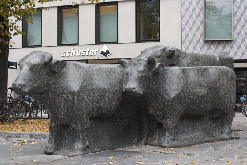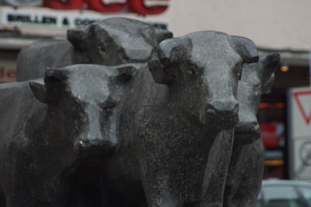 von einer mächtigen Bronzegruppe gekrönt. Sie zeigt drei Rinder,