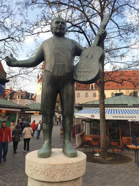 Brunnen ist dem Gstanzlsänger Roider Jackl gewidmet. Der am 17. Juni 1906 in Weihmichl bei Landshut geborene Roider Jackl war von Beruf eigentlich Förster. Er schaffte es, das Gstanzlsingen von Wirtshausbühnen in das Licht der Scheinwerfer zu heben, indem er mit überdurchschnittlicher Könnerschaft diese Form des kurzen Spottliedes darbot. Er nahm sowohl aktuelle politische Geschehnisse aufs Korn wie auch allgemein menschliche Schwächen. Er war Mittelpunkt in der "Weiß - blauen Drehorgel" oder auch beim Salvatoranstich (zwischen 1954 und 1974) auf dem Nockherberg. Zwei Jahre nach seinem Tod am 9. Mai 1975 in Freising, kam er auf dem Viktualienmarkt im Stadtbezirk 01 - Altstadt - Lehel in dem von Hans Osel gestalteten Brunnendenkmal zu Ehren. Der Bronzeguss wurde von der Kunstgießerei Werner Braun ausgeführt, der Brunnenaufbau aus Marchinger Muschelkalk durch den Münchner Steinmetz Hans Rehm gestaltet. Die eingravierte Inschrift gibt bekannt: "Roider Jackl, Förster, Gstanzlsänger, Levitenleser". Die Brunnensäule hat sechs Ausläufe, die wie kleine Kanonen auch nach Roider Jackls Tod auf Politiker, Großkopferte, Siebengescheite, Protzerte, Großmäulige, Gwapplte und Bazis zielen. Der Brunnen wurde von Hans Osel gestaltet. Er hat einen durchschnittlichen Jahres - Wasserverbrauch von 5722 Kubikmetern. Der "Roider Jackl" war der "weiß - blaue Troubadour und G´stanzlkönig". Schon zu seinen Lebzeiten sang er von "A Denkmal, wo‘s Wasser rausrinnt": "Und bal der Hahn kraht, nacha kraht er am Mist - Nacha ändert sich‘s Wetta oder‘s bleibt wia‘s is. Jetzt muaß i aufhör‘n zum Singa - sonst werd ‘ i berühmt - Sonst kriag i a so a Denkmal - wo‘s Wasser rausrinnt." Jetzt hat er‘s, dargestellt in der Pose, in der er beim Starkbier - Ausschank jahrzehntelang die "Großkopferten" derbleckte. Er habe, so OB Georg Kronawitter, "mit seiner Jägerfaust nach manchem Großkopferten gegriffen..." Als Denkmal - Sponsoren für den größten Bayerischen G‘stanzl - Macher durften die möglicherweise gar nicht von ihm "Derbleckten" dann doch den Brunnen aufdrehen: Generaldirektor Paul Werner von der Bayern - Versicherung und Konrad Peteranderl, Bezirksdirektor von der Landesbausparkasse. Stadtpfarrer Müller (Heiliggeist) und Zistl (St. Peter) seien sich zwegens der Brunnen - Zugehörigkeit beinahe in die Haare geraten, weil die Gemeindegrenze "net grad pfeilgrad" durch den Viktualienmarkt verläuft. Dieser Brunnen ist ebenfalls ein ausgewiesener Trinkbrunnen. Es handelt sich hier um einen städtischen Brunnen. |