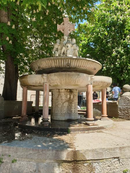 Der prachtvolle, romanische Brunnen besteht aus drei Wasserbecken unterschiedlichster