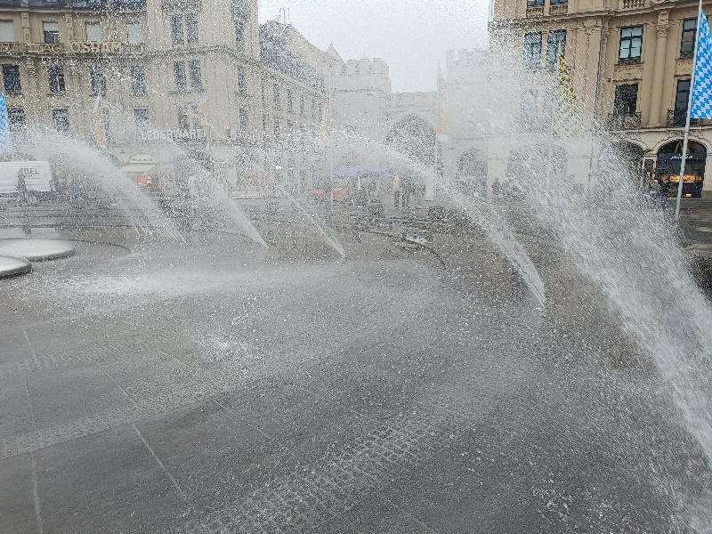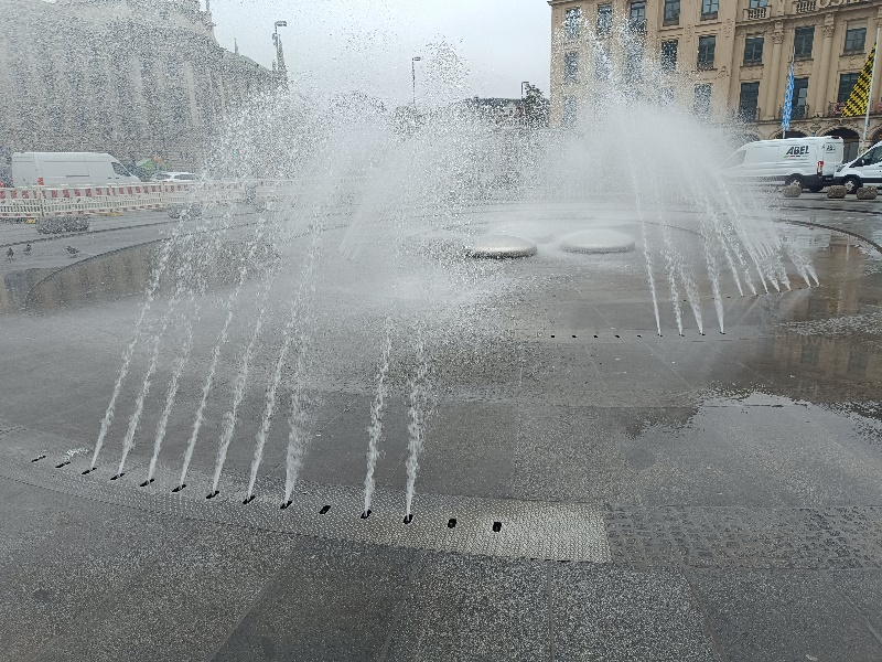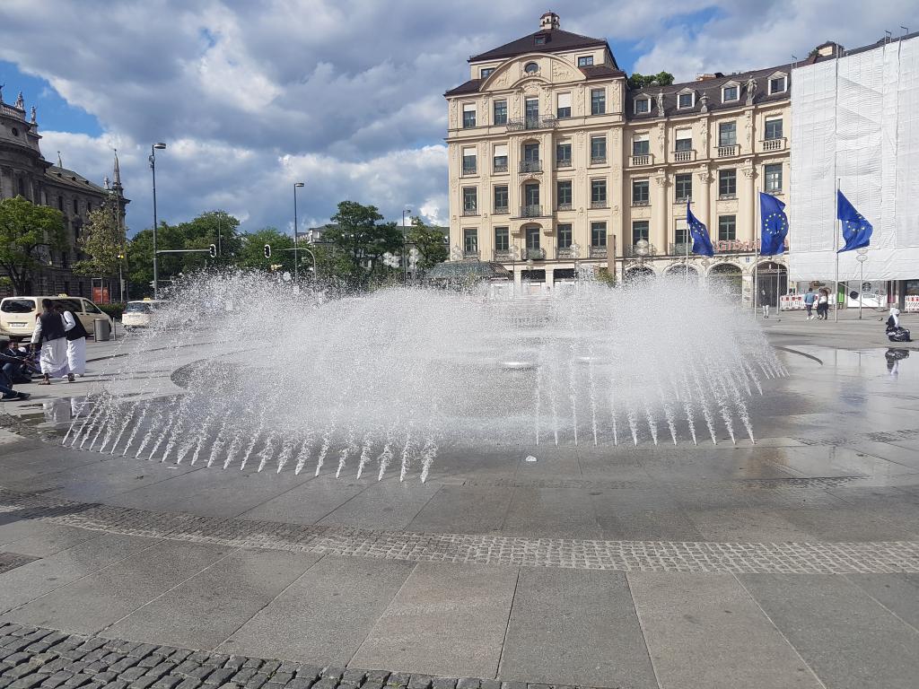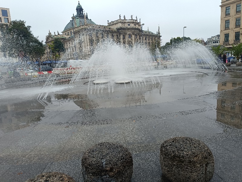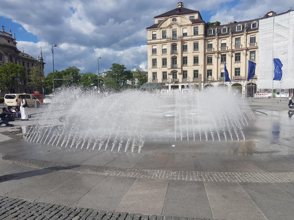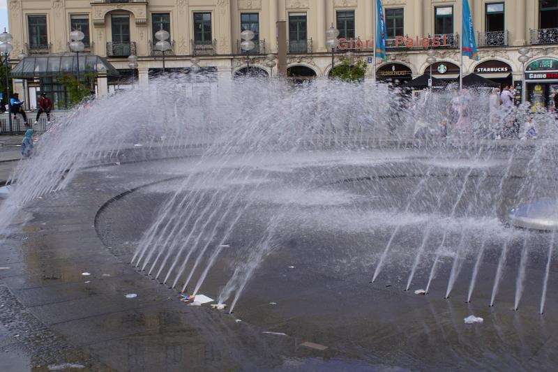 von unten. Außerdem sind um die Stachus - Fontäne, die sich
