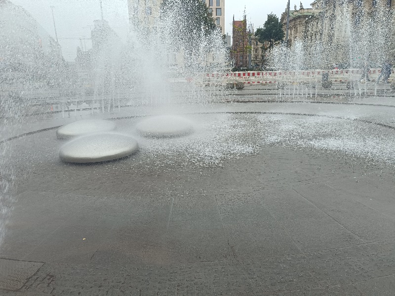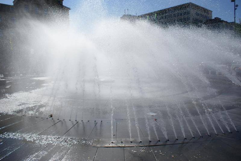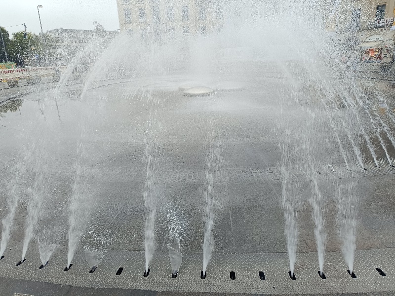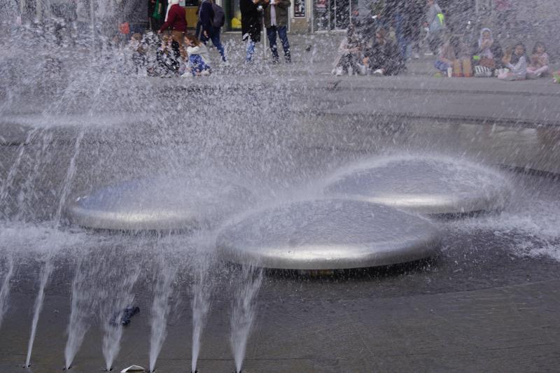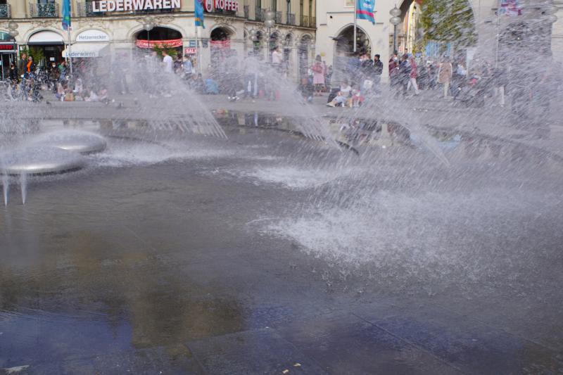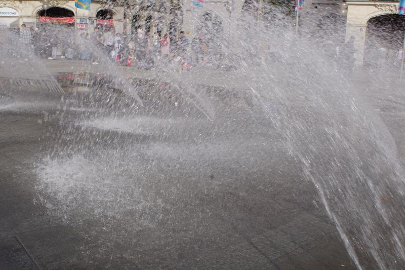 Erfrischung suchende Passanten. Dazu, ebenso rundherum, immer wieder auch